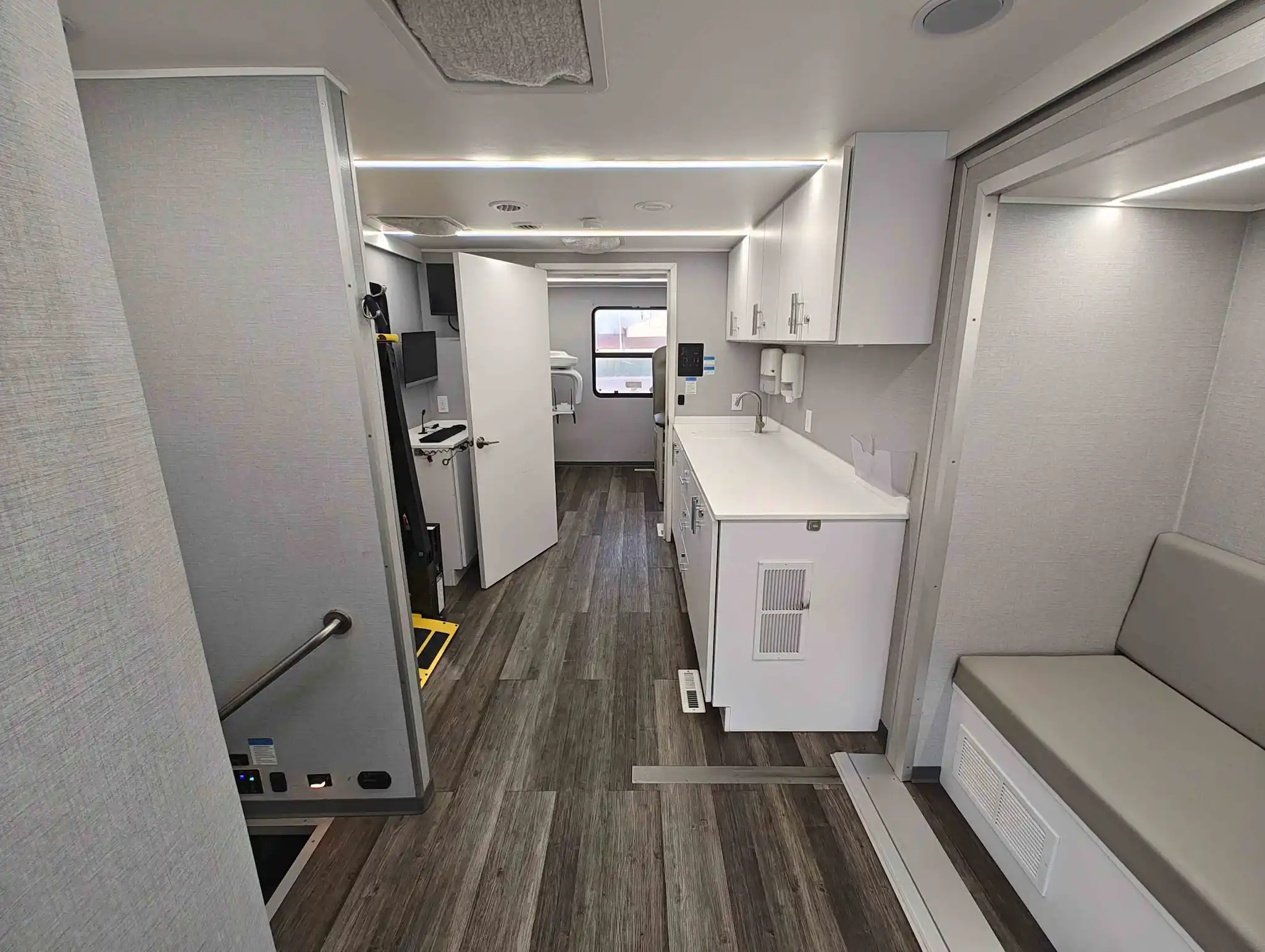 For sale is a 2014 mobile clinic on a Ford Motorhome chassis with 102,784 miles. This unit has been meticulously maintained and is in great condition! The vehicle has a LCI electronic leveling system, 7 Kw Cummins generator, and a 50-amp shore power. The front exam room is designed for streamlined diagnostics and includes a standing desk, Humphrey Field Analyzer, workstation, upper and lower cabinetry, a Magic Chef convenience refrigerator, and Dometic rooftop AC, along with an audio sound booth (Whisper Room) for precision hearing evaluations. The middle room enhances patient accessibility with a Braun wheelchair lift, comfortable bench seating, upper and lower locking cabinets, a heated sink, and a fully equipped patient triage station. The rear exam room includes a Brewer access exam bed, Dometic rooftop AC, and additional secure upper and lower cabinetry for clinical storage. The exterior of the unit has a power awning, exterior TV monitor, storage compartments, and a RVS camera system.