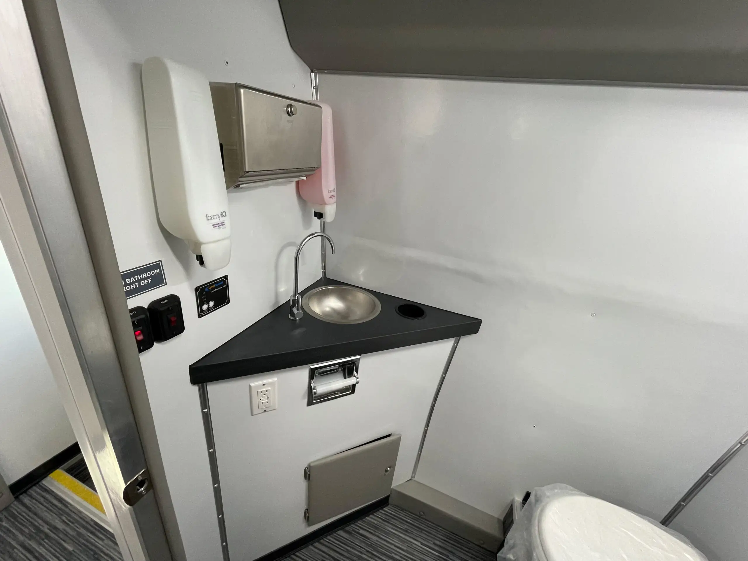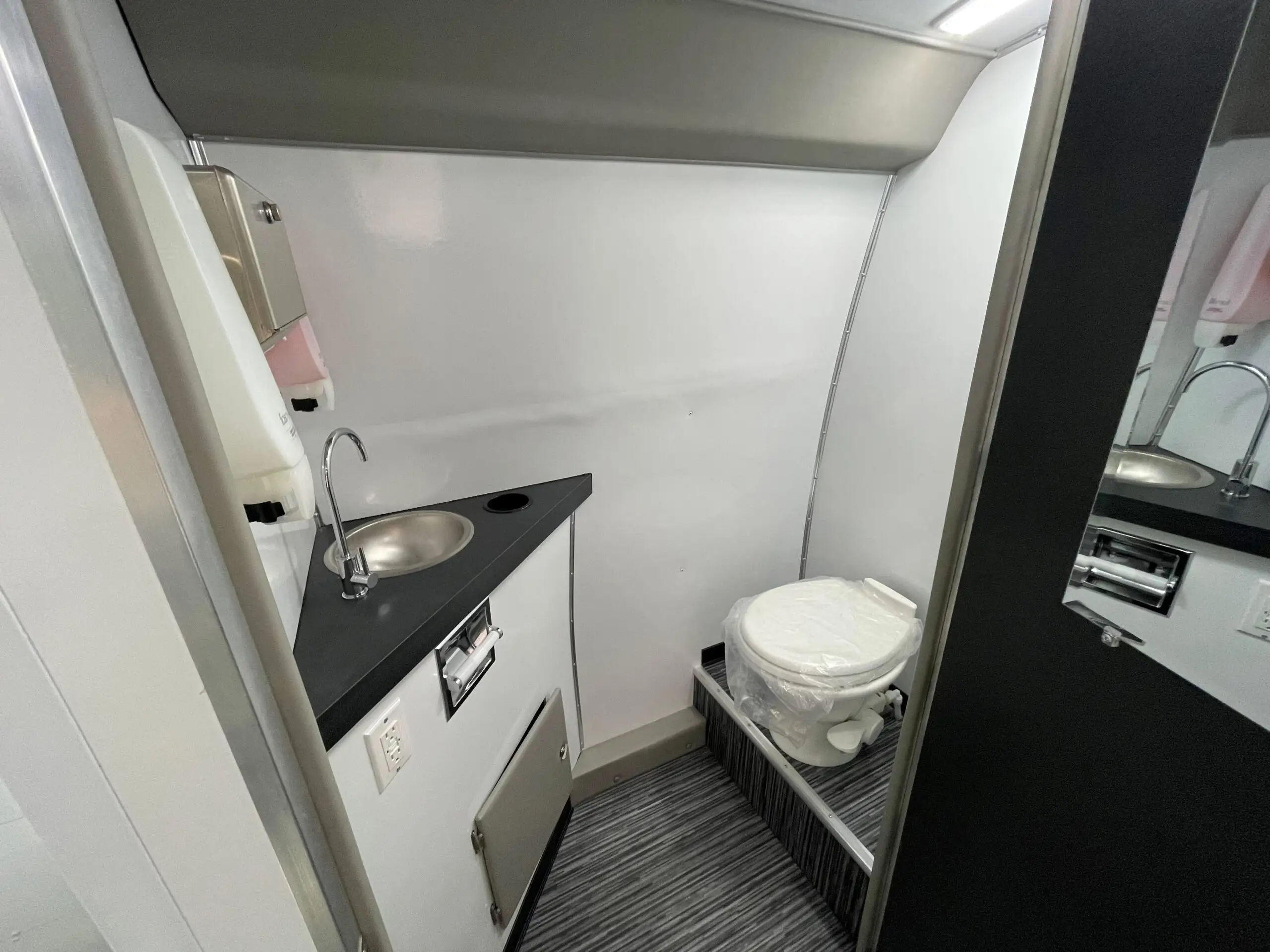 - Lavatory Room with Toilet, Sink, Mirror, Paper Towel Dispenser, and Trash