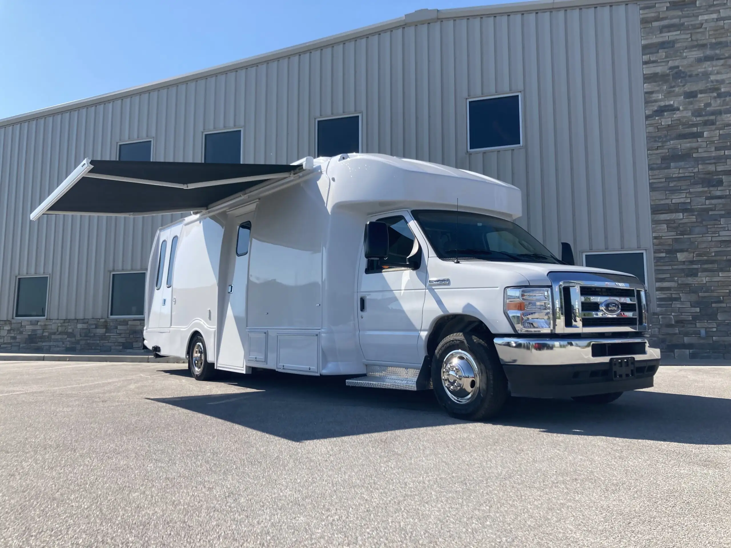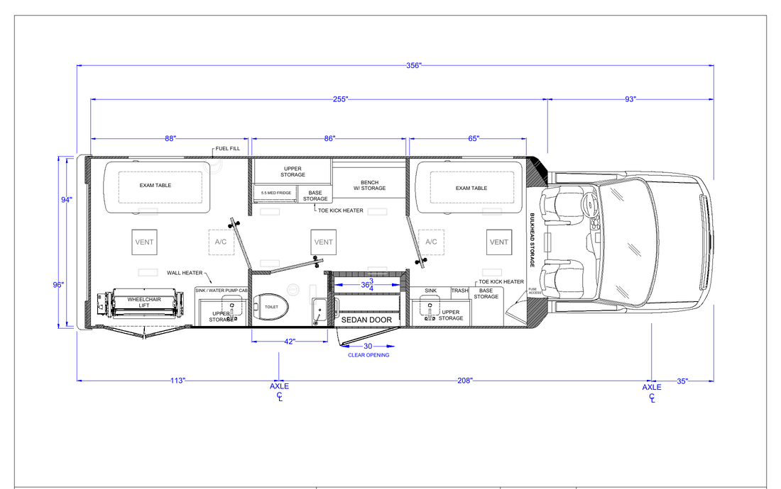 The new Ford E-450 at 30′ offers three separate spaces for services, including wheelchair accessibility, maximizing productivity. Its larger size provides a comfortable and spacious feel, yet remains nimble enough in limited parking areas. Standard features include an exam table, medical-grade fridge, and bathroom, with a true five-sided structure for safety. With its aerodynamic exterior and comfortable interior, the Ford E-450 is a reliable and efficient vehicle, ideal for programs requiring space, accessibility, functionality, and safety.