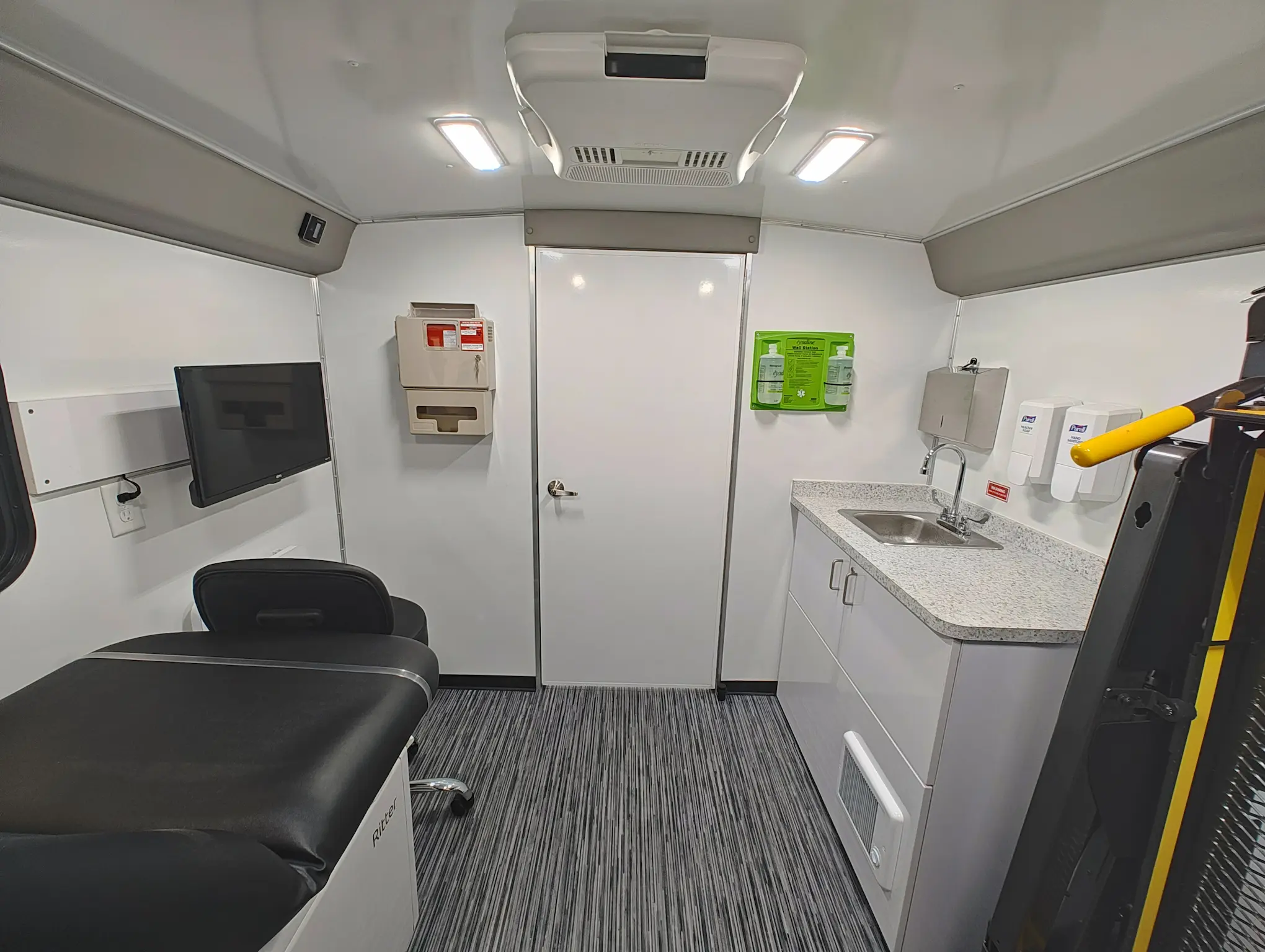 The Ford E-450 is a versatile multi-room mobile medical unit designed for efficient healthcare delivery. Powered by a 7.3L gasoline engine with automatic transmission and a 14,500 lb GVWR, it offers reliable performance across multiple terrains with 50-state emissions compliance. The layout includes a front exam room with DEA-approved safe and bulletproof dispensing window, a middle room with jump seat and medical-grade refrigerator, and a wheelchair-accessible rear exam room equipped with a Ritter 204 table, Welch Allyn diagnostic board, and 800 lb certified Braun lift. Climate control comes from dual rooftop air conditioners and floor heaters, while the commercial-grade Cummins Onan 7kw generator provides dependable power for mobile operations.