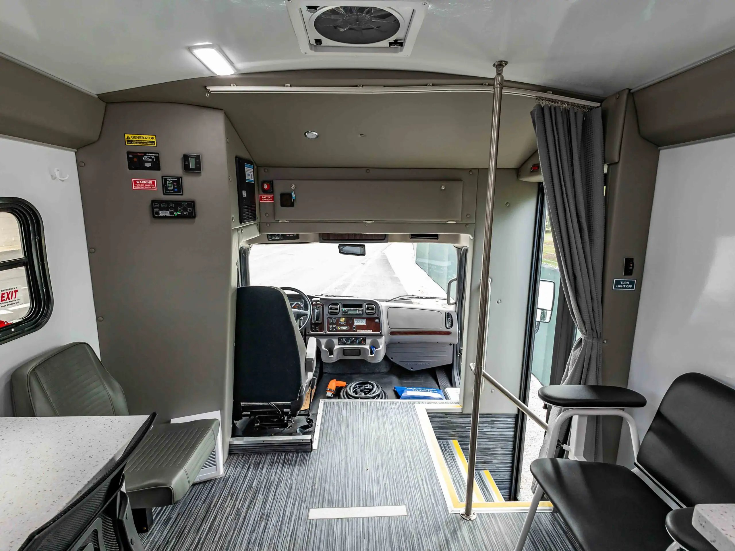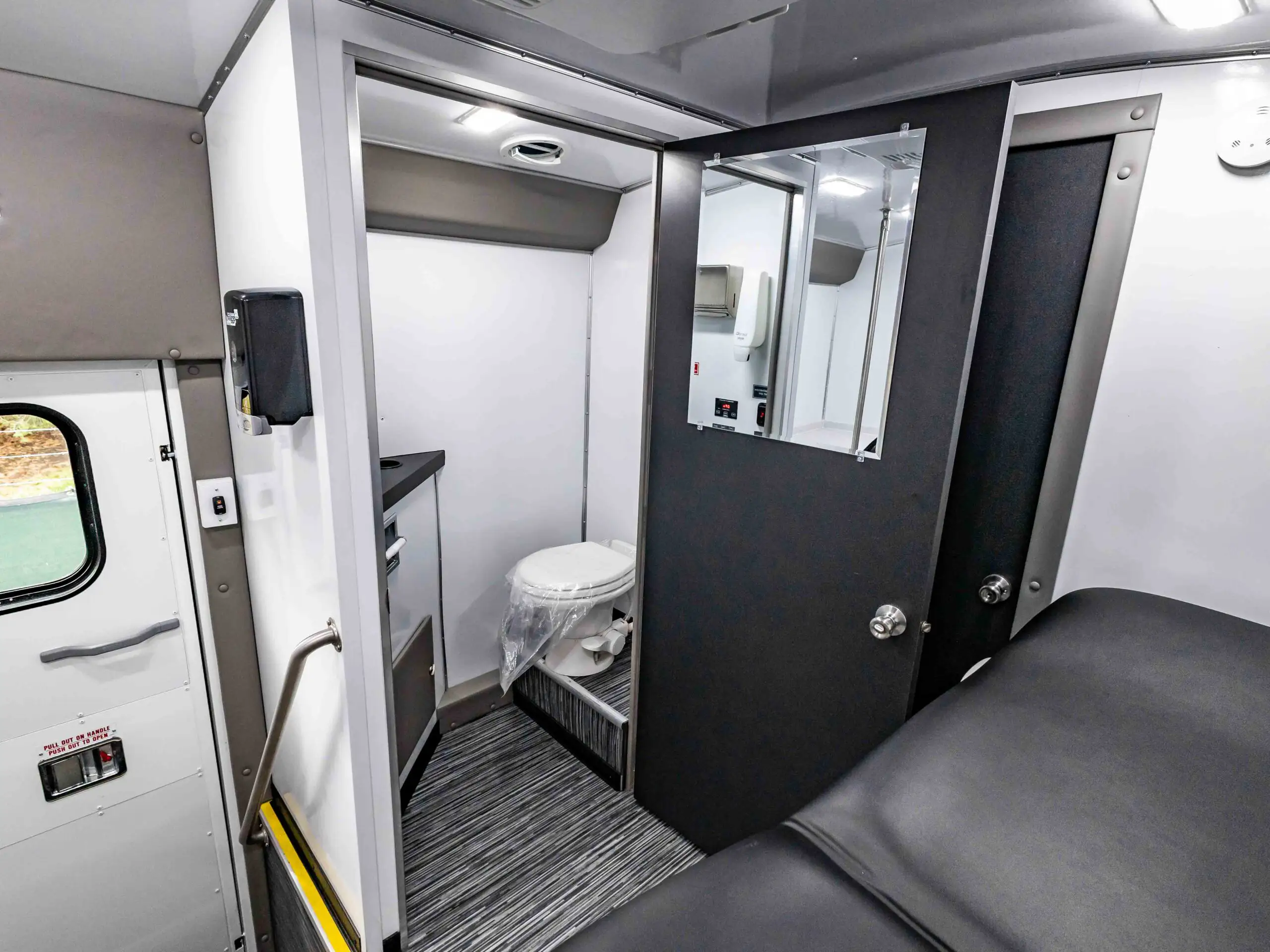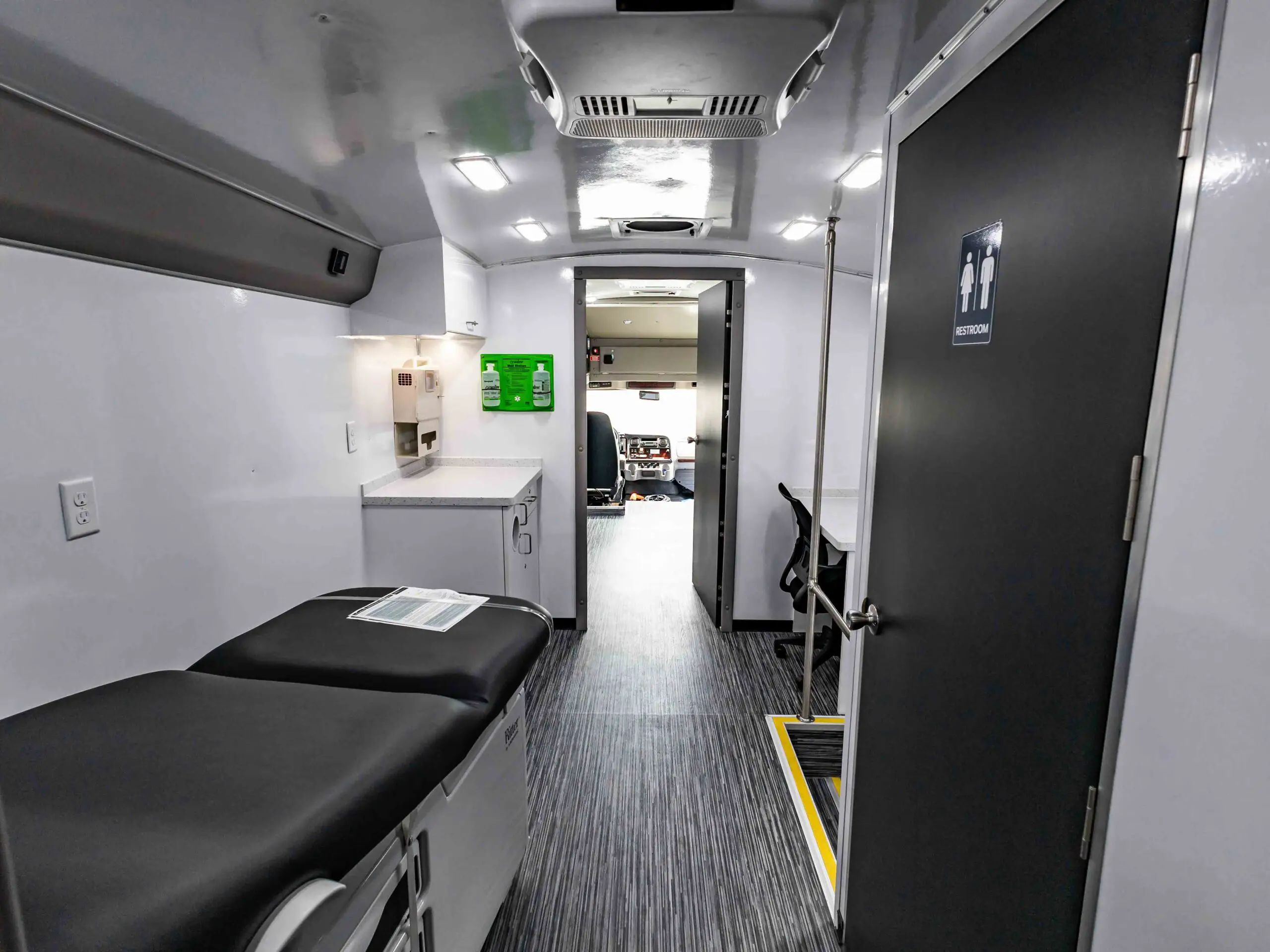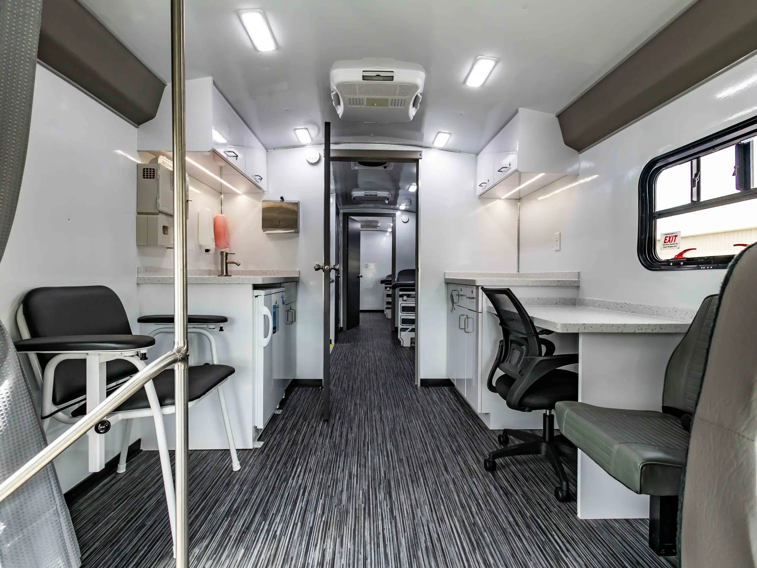Our new flagship Freightliner mobile unit offers wheelchair accessibility and two private entry doors, with a length of 40 feet. It has three entry points and three private rooms, ideal for multi-modality healthcare services like dental or primary care. The straight wall exterior design and comfortable interior add to its ample room, and standard features include an exam table, medical-grade fridge, and bathroom. This mobile unit offers top-notch stability, comfort, dependability, quality, and safety, making it a class leader in the market for any customer application.