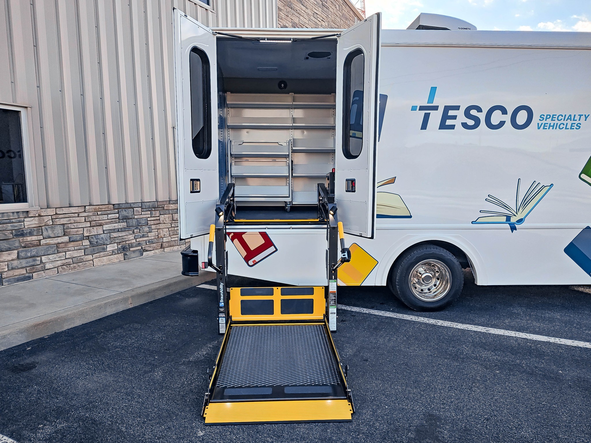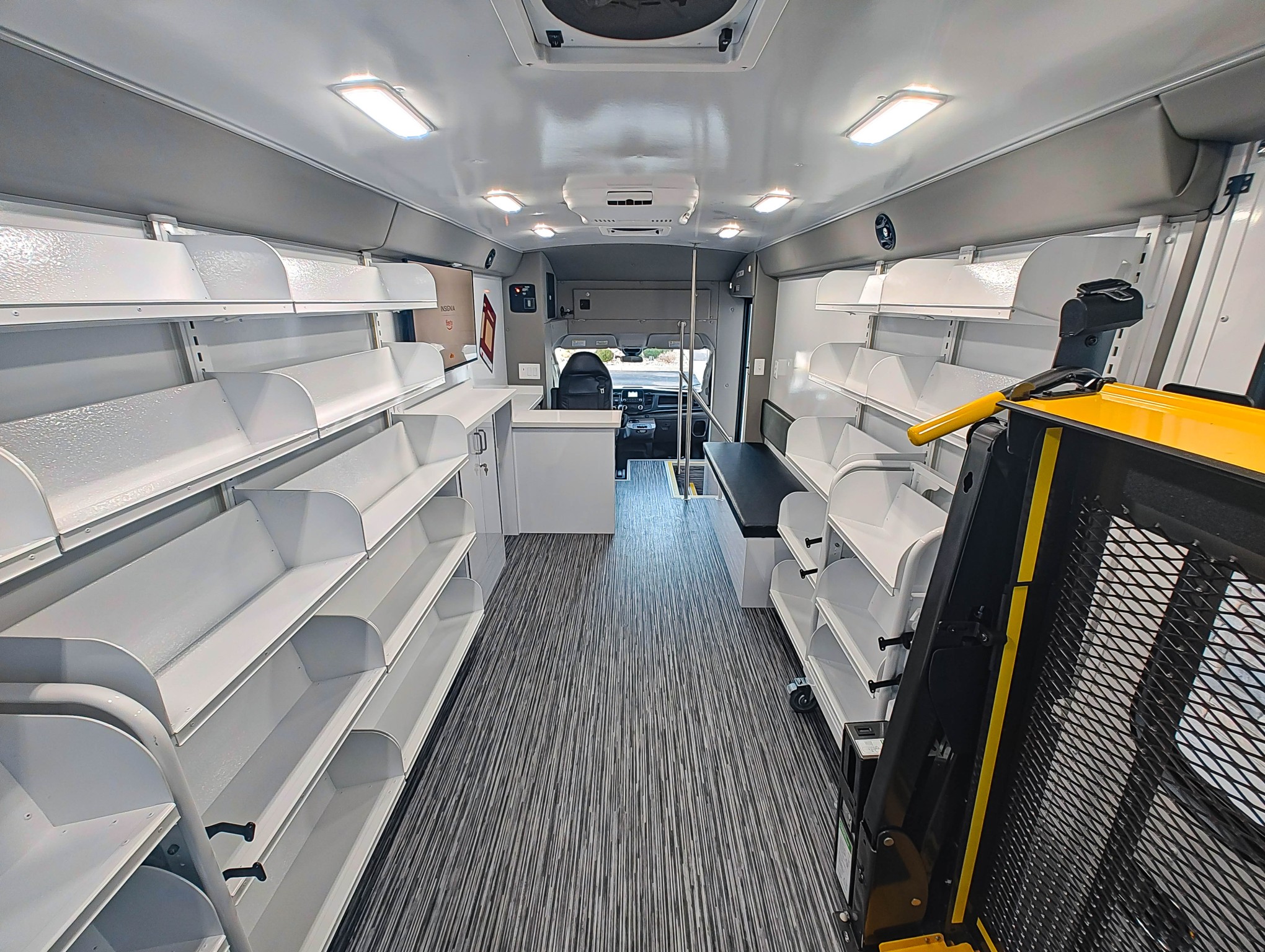 The new Ford Transit is a fully equipped mobile library unit with two separate entry points—a heavy-duty electric door for ambulatory access and a wheelchair-accessible entrance with an 800 lb commercial lift—for maximum accessibility and throughput. It features LED lighting, Acore shelving and book carts, a circulation desk, bench seating with storage, and climate control with roof AC. Standard amenities include a 4kw Onan generator, 50 amp shore power, multiple outlets, an eyewash station, bathroom facilities, and durable Altro faux wood flooring. The Ford Transit mobile library is a versatile, accessible, and reliable solution for bringing library services directly to communities.