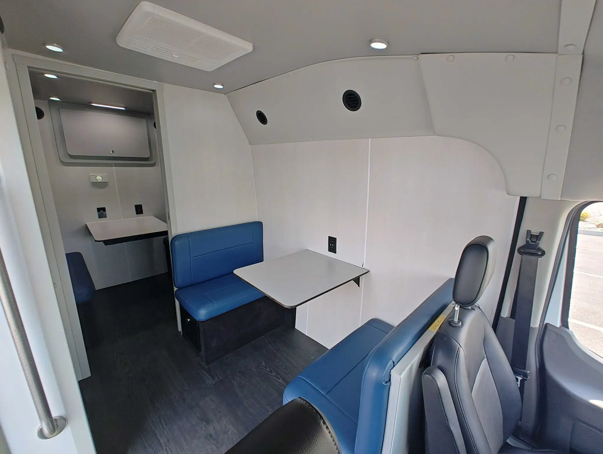 For sale is a 2022 Ford Transit Mobile Office/ Consultation Clinic with only 5,110 miles. This clinic is in pristine shape and is ready for action immediately! The unit would be perfect for a mobile office or a behavioral health clinic! This clinic comes equipped with a 4 Kw Cummins Onan generator, Fiamma F65 eagle power awning, dual exterior GFCI outlet, Dometic rooftop AC, and backup camera system. The interior of the unit includes (2) meeting table with bench seating, a sliding privacy door to separate the meeting rooms, rear upper storage compartment, Defender carbon monoxide alarm, and storage beneath the front benches.