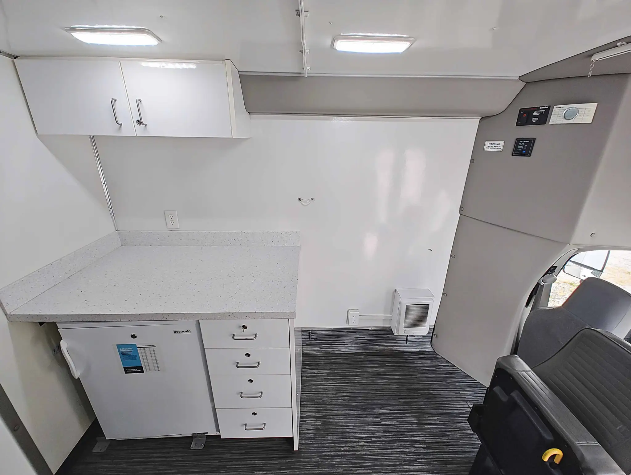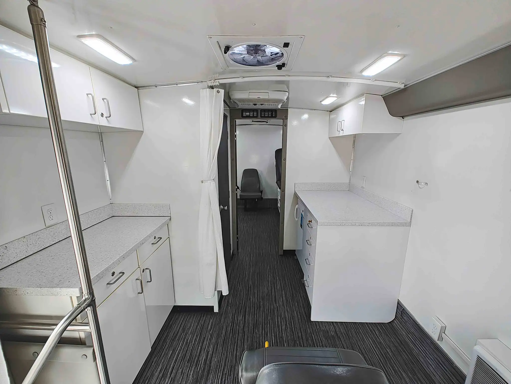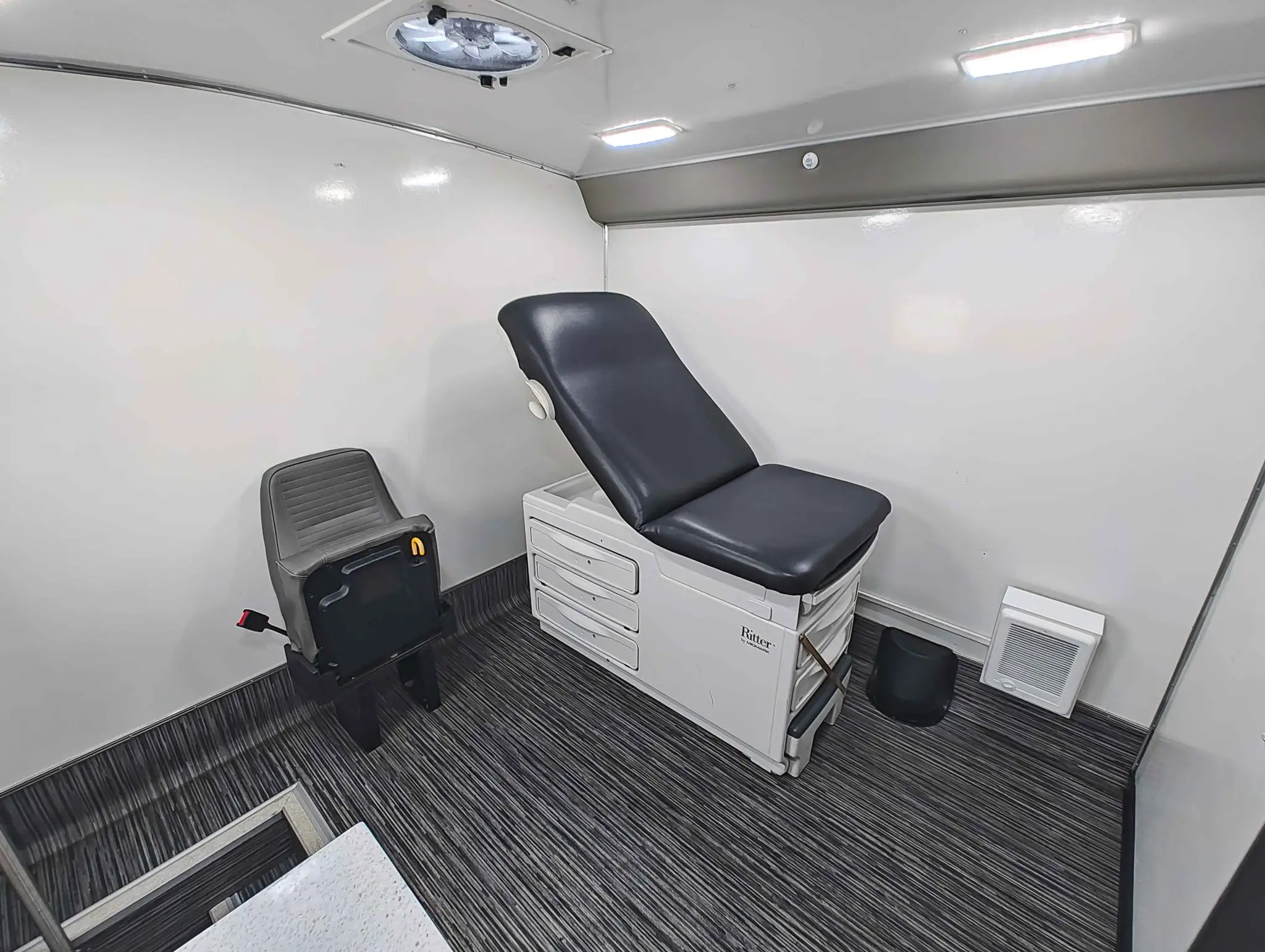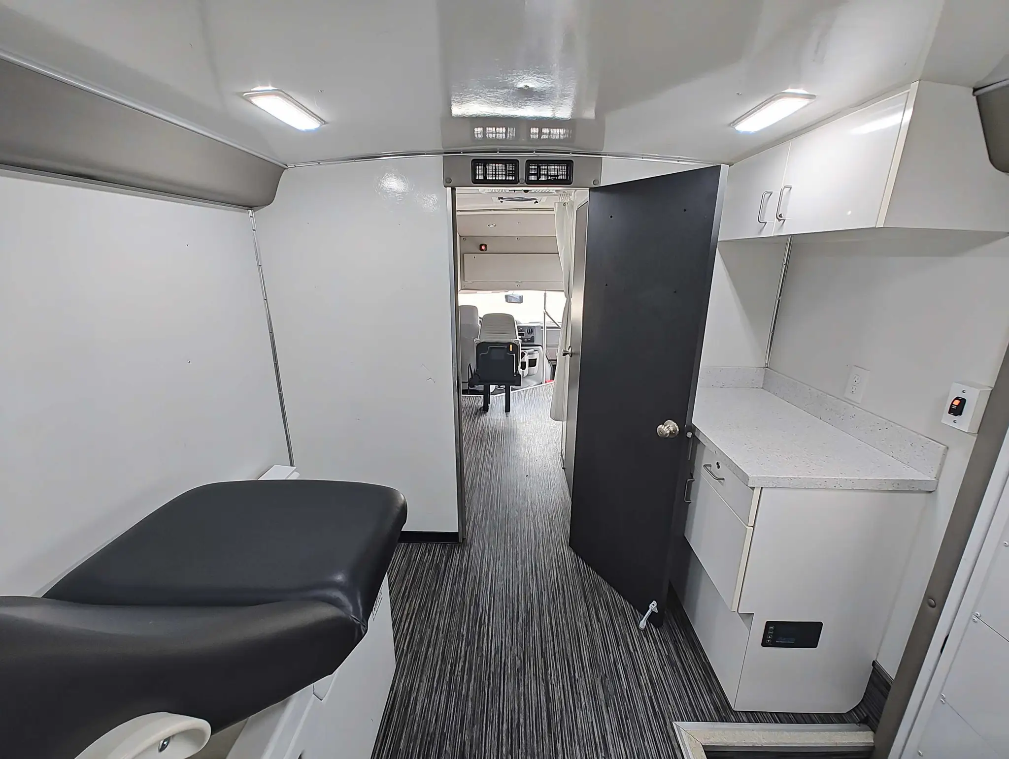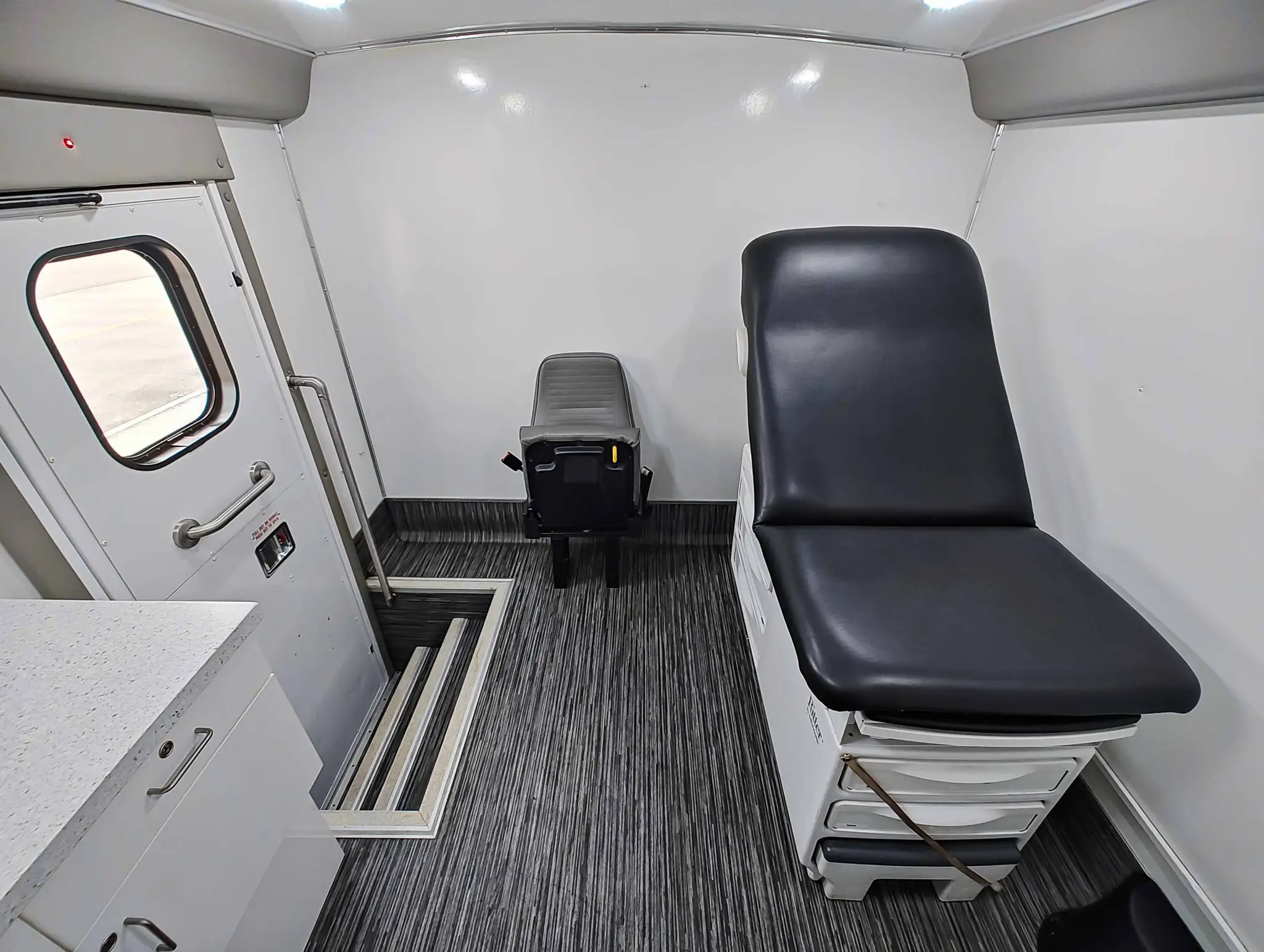 For sale is a 2021 Mobile Clinic with only 27,894 miles! This dual-entry unit features a 7 kW Cummins Onan Generator, 50 amp shore power access with a cord, and a RVS camera system. The front exam room includes upper and lower locking cabinets, Accucold medical fridge, rooftop power vent, Dometic rooftop AC, and a flip seat for an additional passenger. The bathroom is equipped with a sink, rooftop power vent, and a Level Guard tank monitor. The rear exam room includes a Ritter 204 exam chair, upper and lower locking cabinets, rooftop power vent, toe kick heater and a flip seat for an additional passenger.
