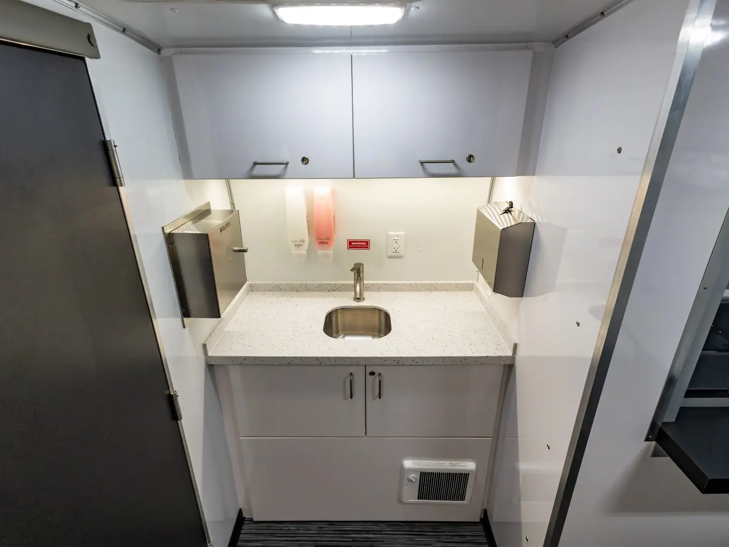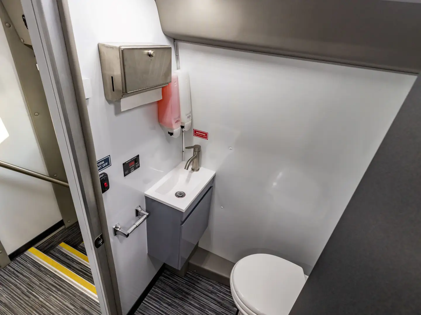 - Lavatory Room with Toilet, Sink, Mirror, Paper Towel Dispenser, and Trash