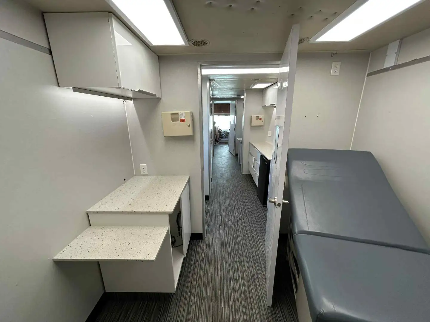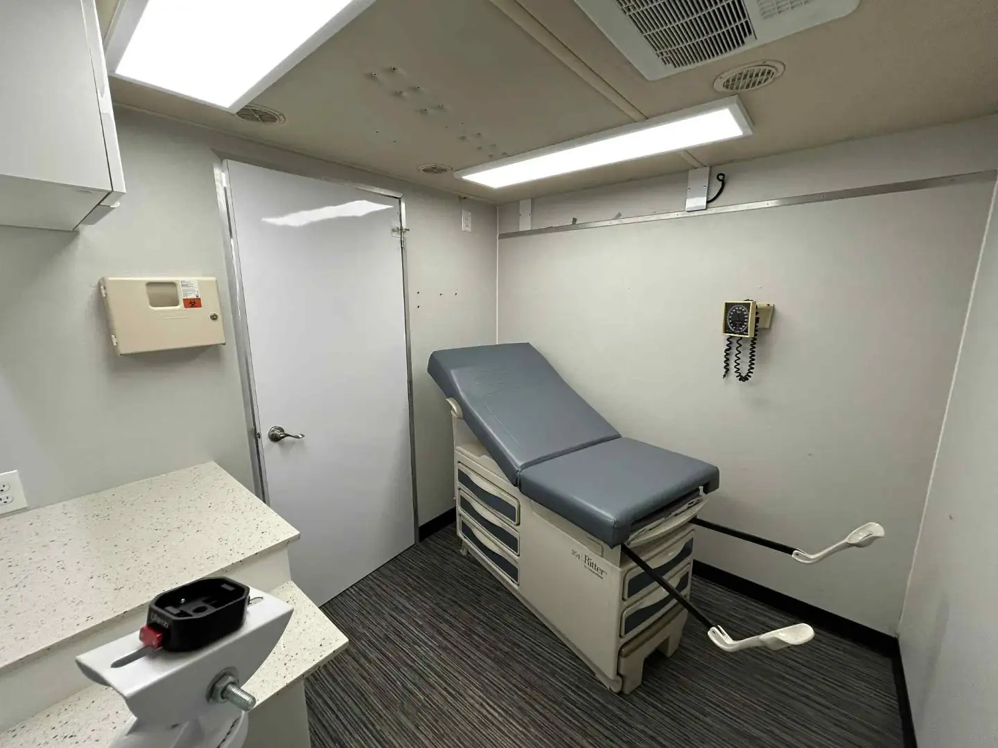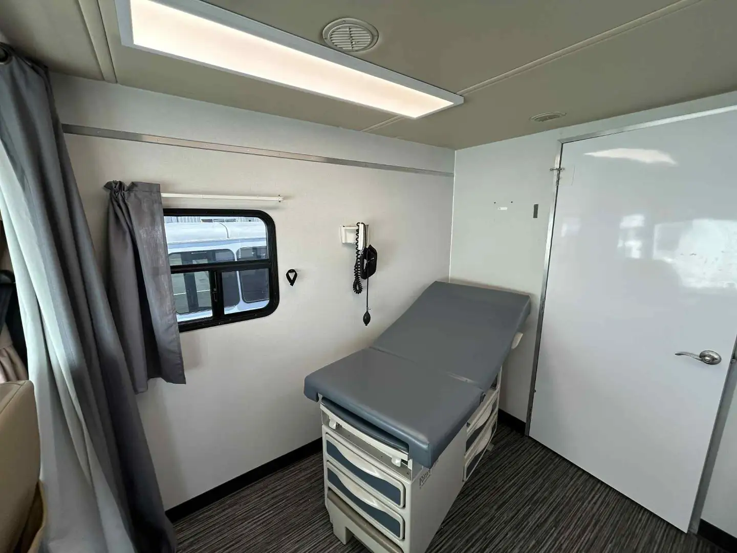 For sale is a 2012 Ford Motorhome mobile clinic with 56,525 miles, in excellent condition and ready for continued use. This well-maintained unit features three separate exam areas, each with privacy doors. The front exam room includes a Ritter 204 exam bed, Welch/Allyn BP cuff, TV monitor mount, and a sink with lower storage. The middle room offers a check-in desk/workstation, bench seating, a Magic Chef convenience fridge, lower locking cabinets, a bathroom with sink and specimen pass-through, and a Seca Stadiometer height measurement. The back exam room is similar to the front but lacks a sink and includes a rooftop A/C unit. This motorhome is equipped with a 10Kw Cummins Onan QD Diesel generator with an interior start button and hour display, 50 Amp Shore Power Access with cord, two Dometic rooftop A/C units, toe-kick heaters, electric entry steps, a backup camera, a Jensen stereo system, and an HWH Computerized Leveling System. For more information or to schedule a viewing, please contact Ben at 419-708-3112