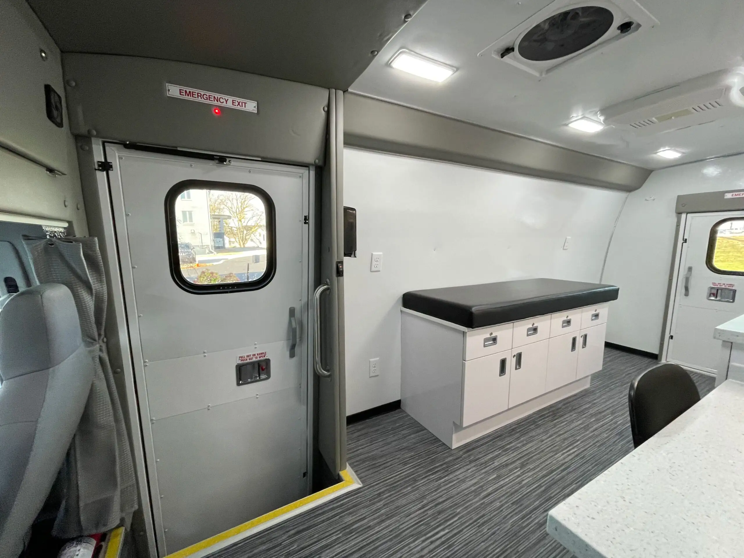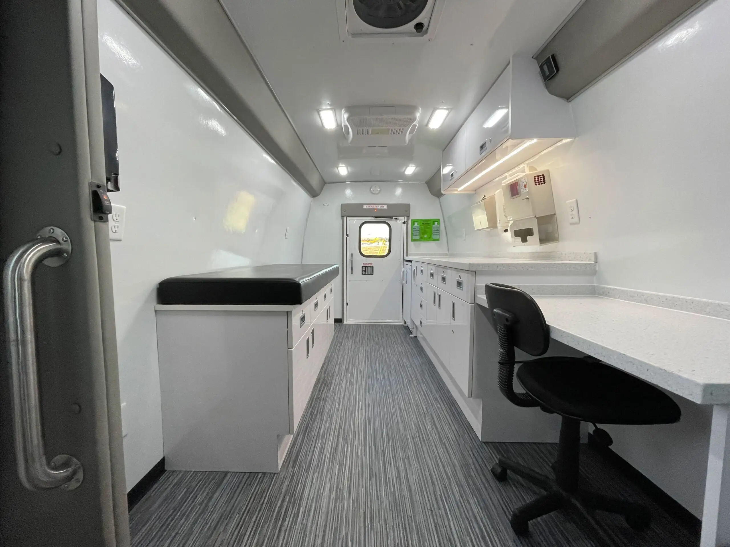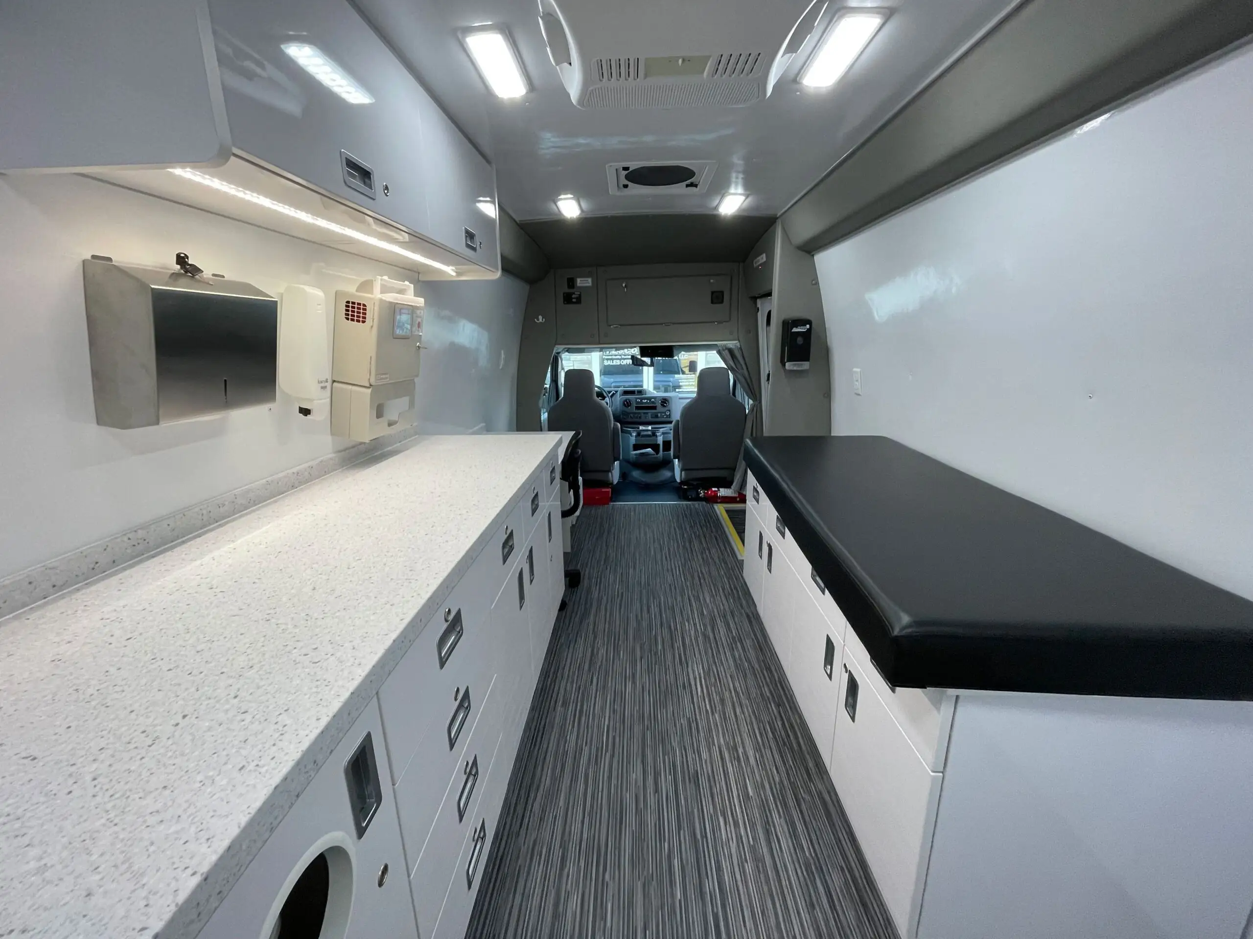 The Ford E-350 is a nimble and versatile single-room unit that maximizes operational efficiency with front and rear access points. It’s ideal for mobile service providers operating in challenging areas. Equipped with a standard one-room exam room, the unit’s true five-sided structure ensures industry-leading safety. The aerodynamic exterior design and comfortable interior make it stand out in the market.