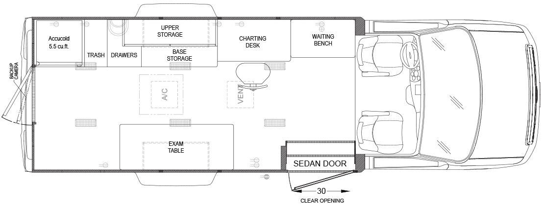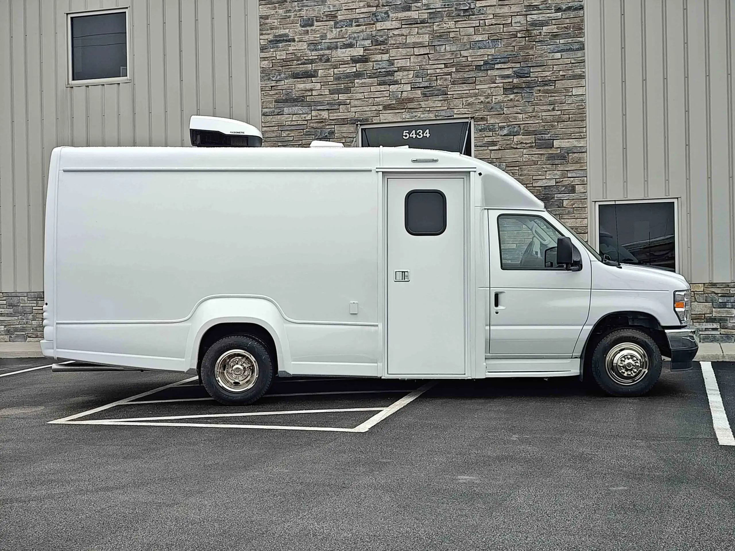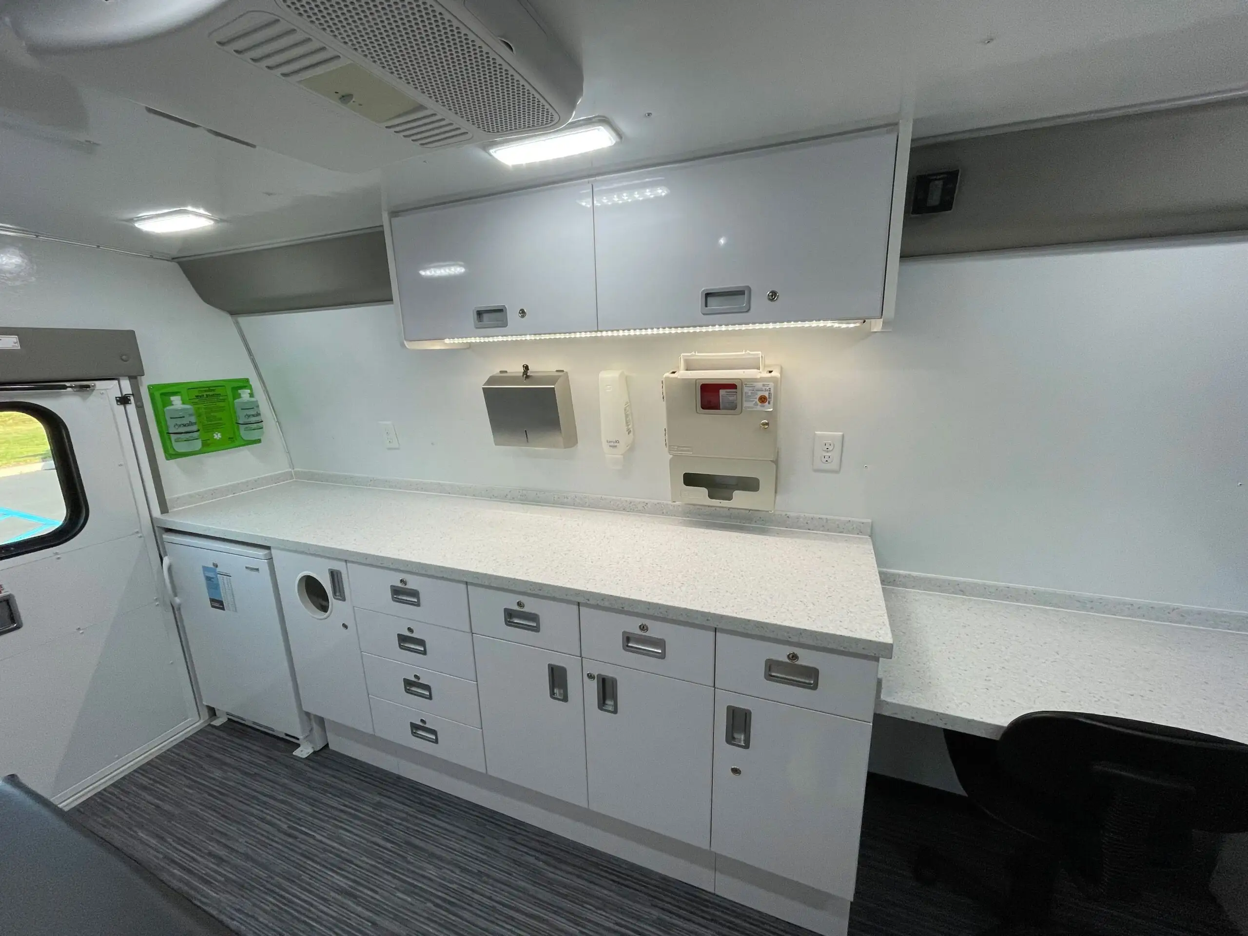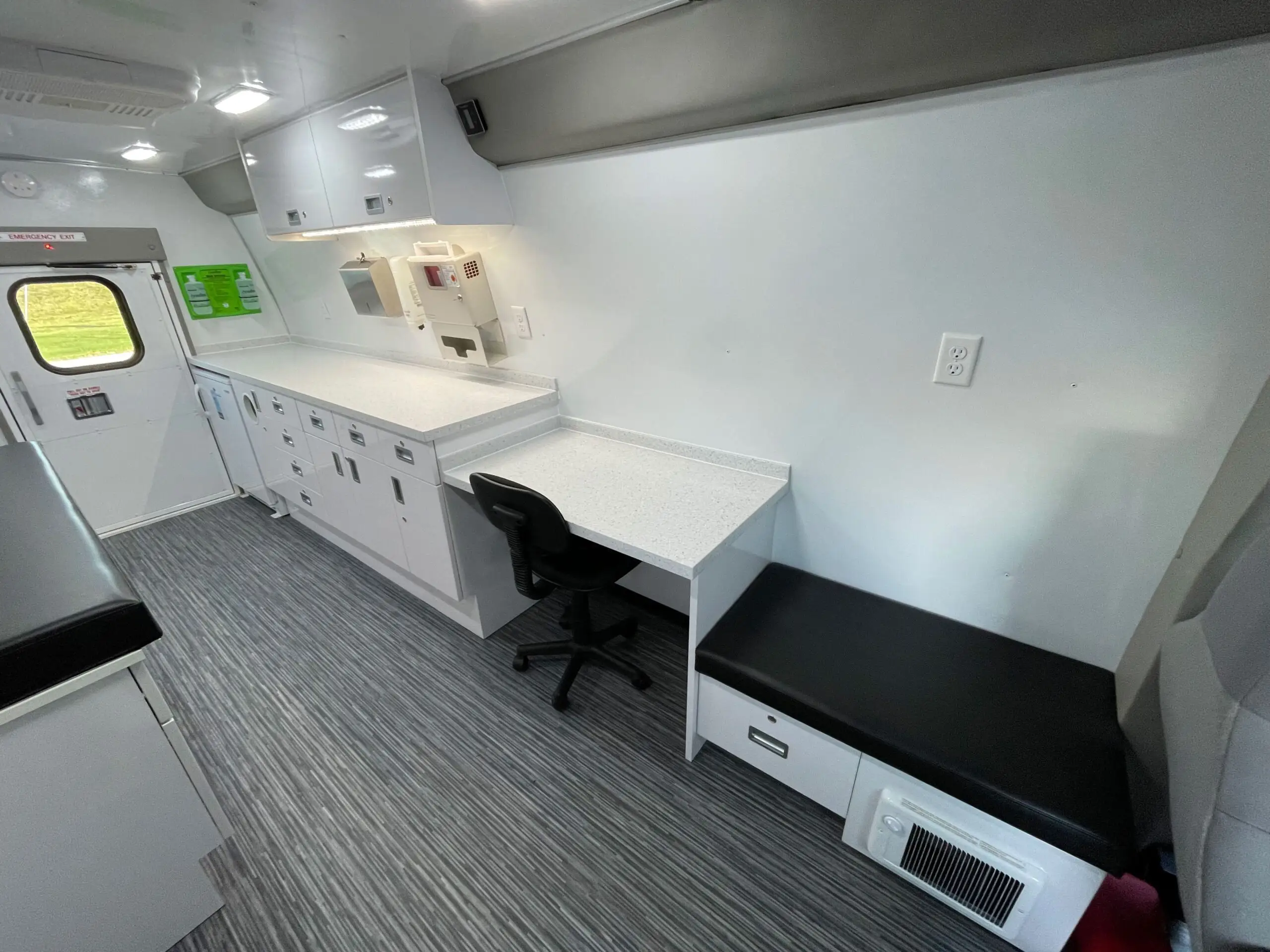 The Ford E-350 is a nimble and versatile single-room unit that maximizes operational efficiency with front and rear access points. It’s ideal for mobile service providers operating in challenging areas. Equipped with a standard one-room exam room, the unit’s true five-sided structure ensures industry-leading safety. The aerodynamic exterior design and comfortable interior make it stand out in the market.