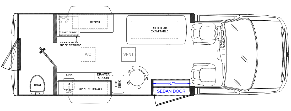 The Ford E-350 is a nimble and versatile single-room unit with restroom that maximizes operational efficiency with front and rear access points. It’s ideal for mobile service providers operating in challenging areas. Equipped with a standard one-room exam room, the unit’s true five-sided structure ensures industry-leading safety. The aerodynamic exterior design and comfortable interior make it stand out in the market.