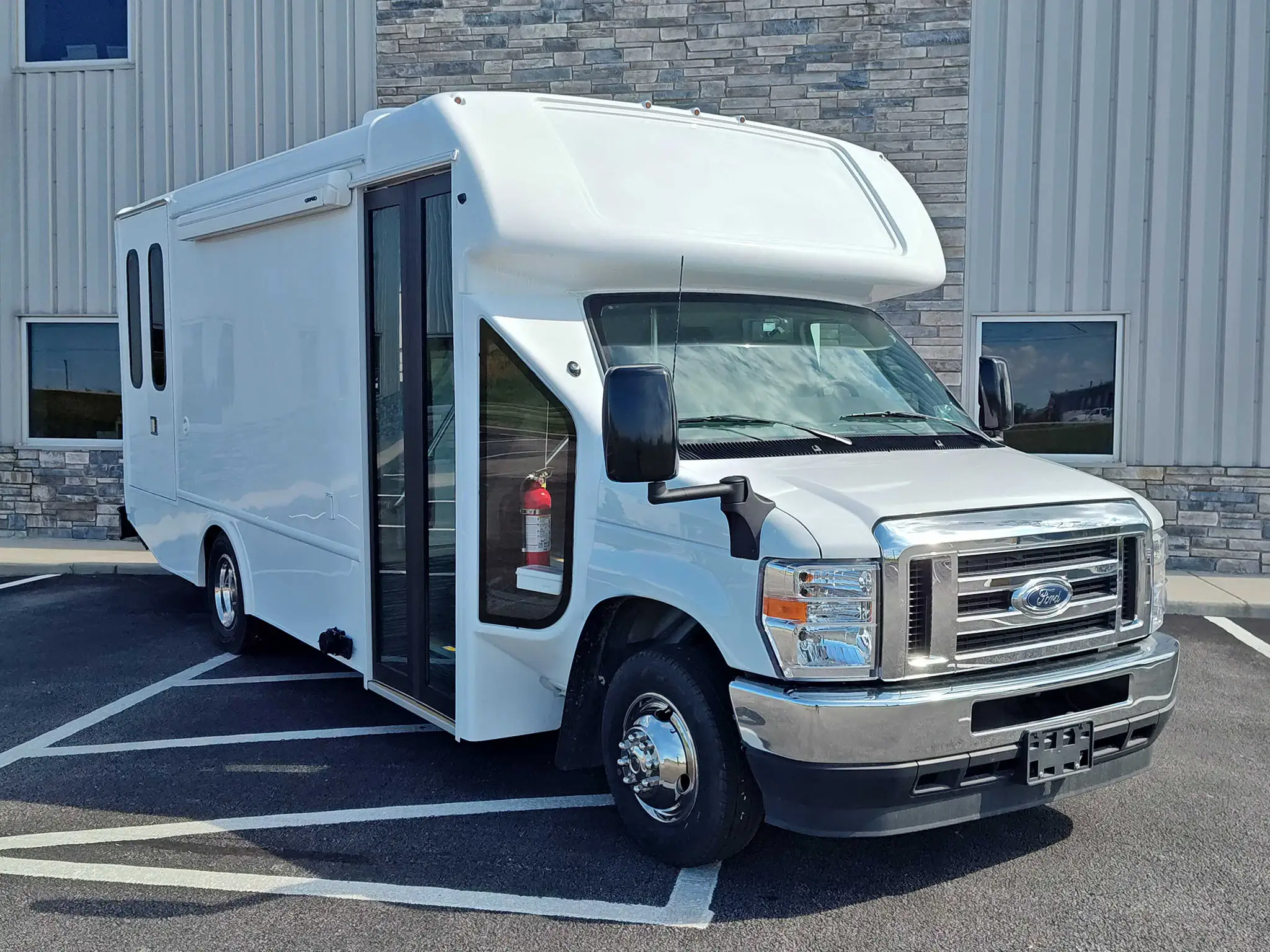 The new Ford E-450 is an economical mid-size unit with wheelchair access and two private rooms, maximizing operational throughput potential. It’s easy to drive and comes with standard features like an exam table, medical-grade fridge, bathroom, and custom cabinetry. The model includes a full roll cage for safety and has a sharp-looking straight wall exterior design. The Ford E-450 is a versatile and reliable option, ideal for programs that require both wheelchair access and flexible service options.