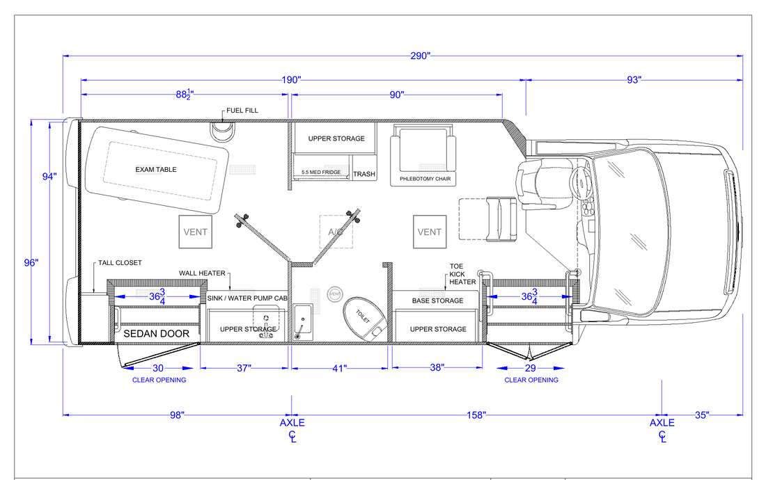 The new Ford E-450 is a mid-sized, two-room mobile unit with flexible service options and two separate entry points for maximum throughput potential. It’s easy to drive and comes with standard features like an exam table, medical-grade fridge, bathroom, and custom cabinetry. The model includes a full roll cage for safety and has a roomy straight wall exterior design. The Ford E-450 is a versatile and reliable option for any customer application, leading its class in the market.