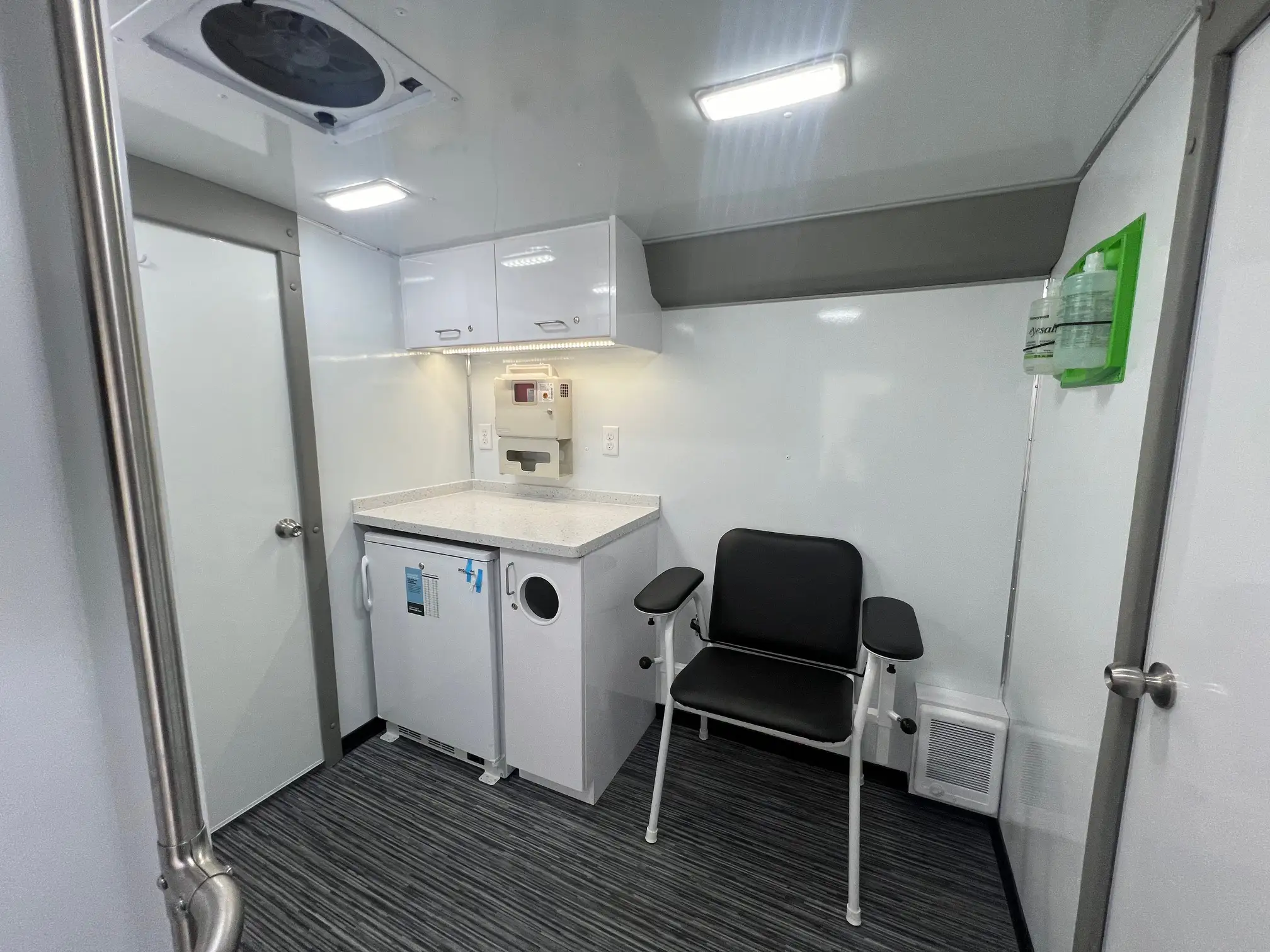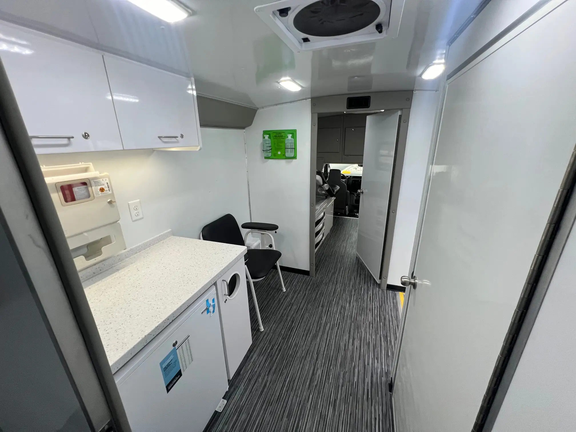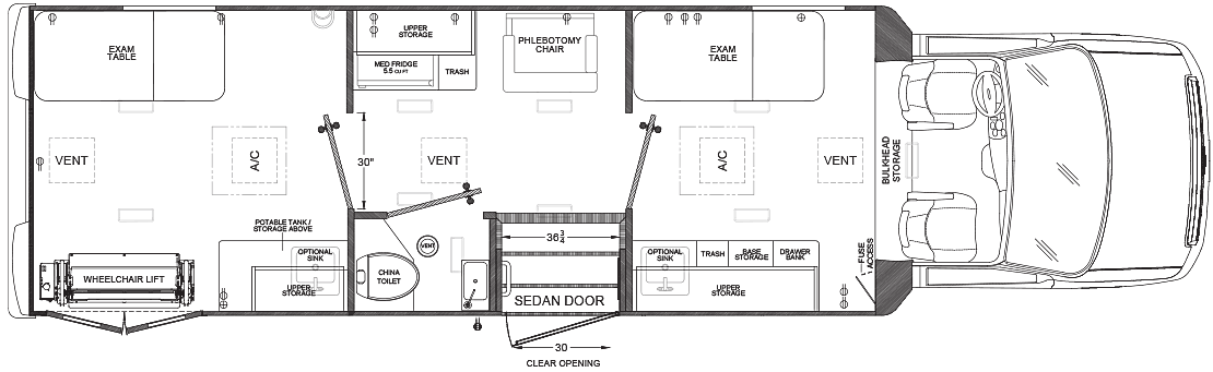 Our flagship mobile clinic comes equipped with numerous standard features, including an exam table, medical-grade fridge, bathroom, and custom cabinetry with hard surface countertops. It offers top-notch road stability, passenger comfort, dependability, quality, and safety, making it the head of its class in the market. This versatile and reliable mobile clinic is a great option for any customer application.
