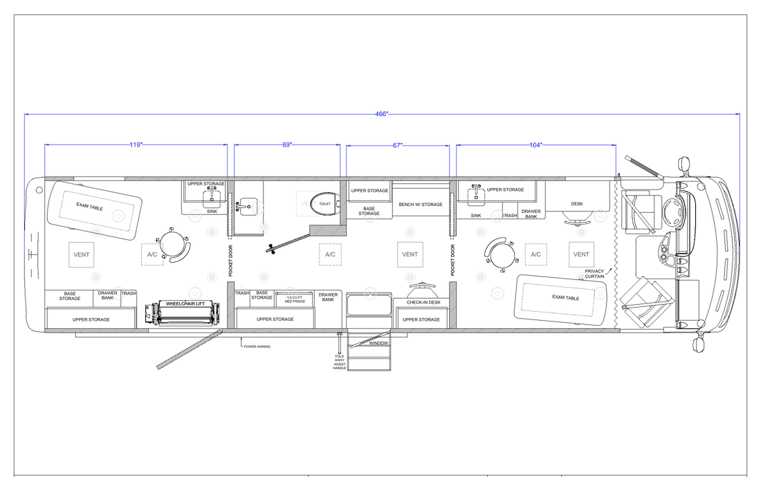Our new 38’ RV clinic is the ideal model for those looking to maximize their space for larger operations. Boasting three large separate rooms, a restroom, and added ceiling height, this Ford F-53 chassis is perfect for conducting multiple exams at once. Key features include wheelchair accessibility, a backup camera system, an 18’ power awning, electric entry steps, and exam room privacy doors, ensuring patient convenience onboard. Built to last, this unit embodies everything one would want in a larger mobile vehicle while staying under the CDL threshold. Constructed on a solid aluminum framework with embedded steel interlocking joints and advanced fiberglass body, this model is unmatched in road durability and safety. If you’re seeking a spacious and accessible vehicle, look no further—this class-leading option has everything you need.