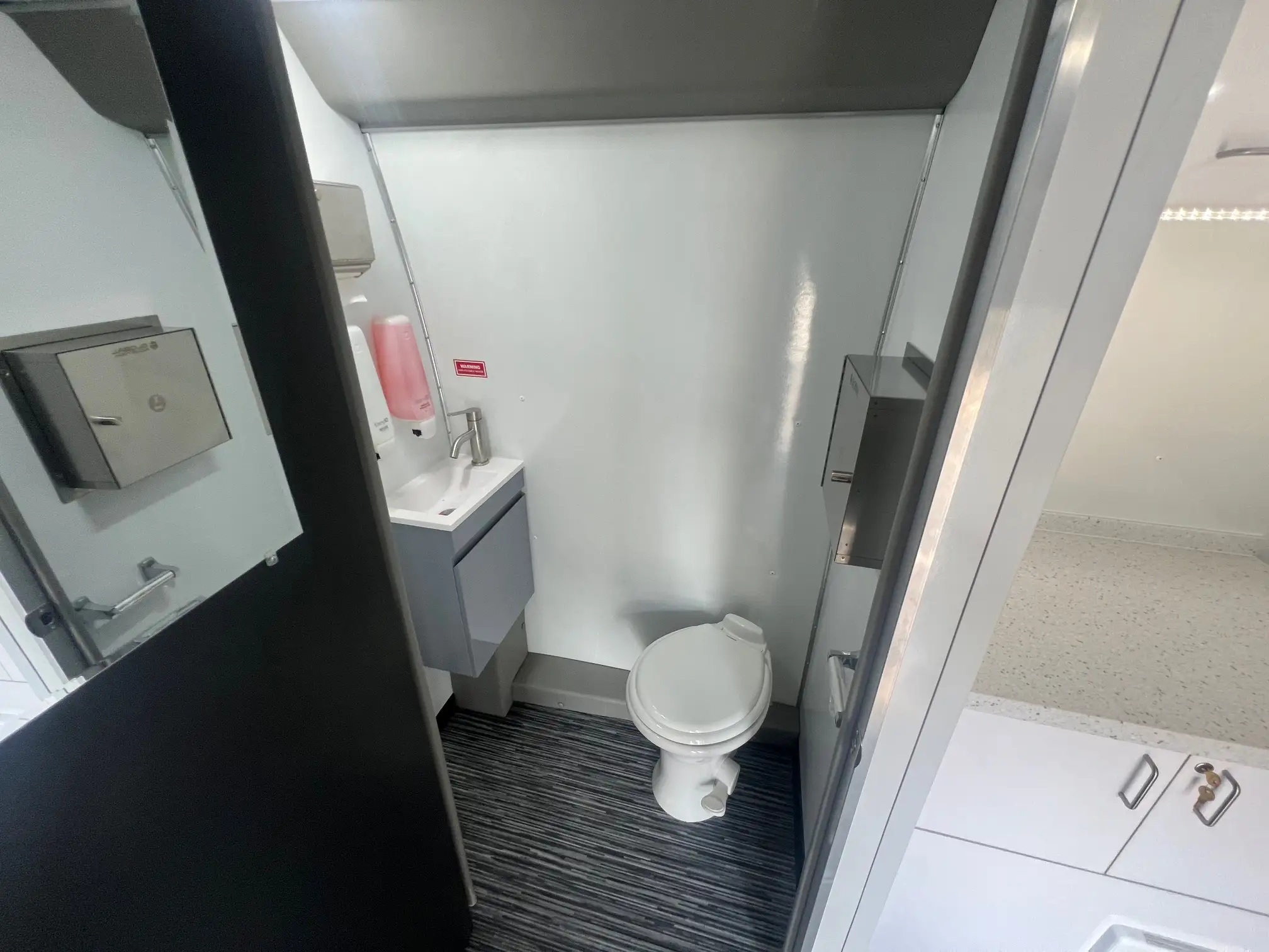 - Lavatory Room with Toilet, Sink, Mirror, Paper Towel Dispenser, and Trash