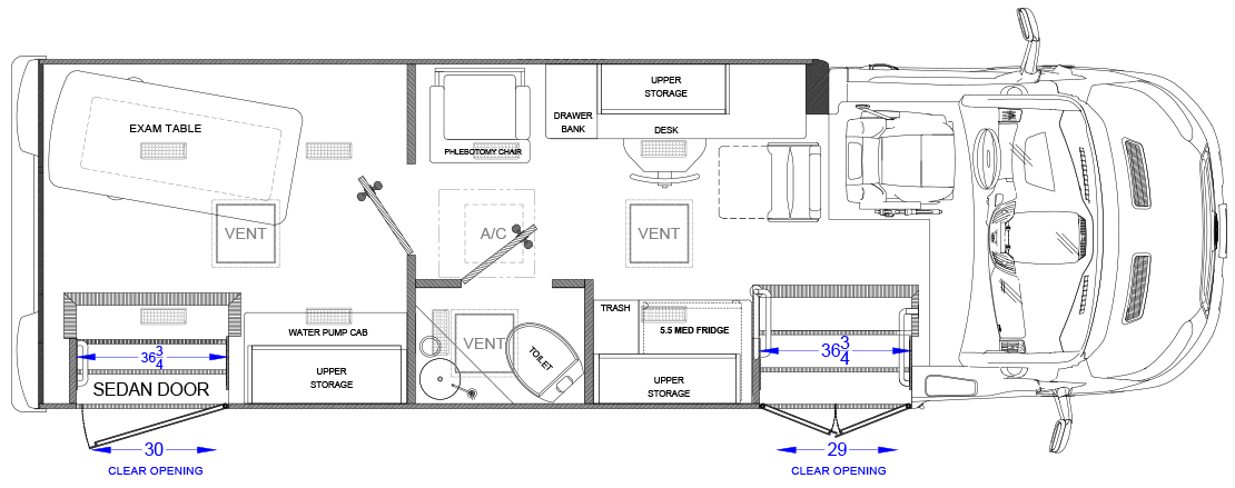 The new Ford Transit is a mid-sized, two-room mobile unit with flexible service options and two separate entry points for maximum throughput potential. It’s easy to drive and comes with standard features like an exam table, medical-grade fridge, blood draw chair, desk, bathroom, and custom cabinetry. The Ford Transit is a versatile and reliable option for any customer application, leading its class in the market.