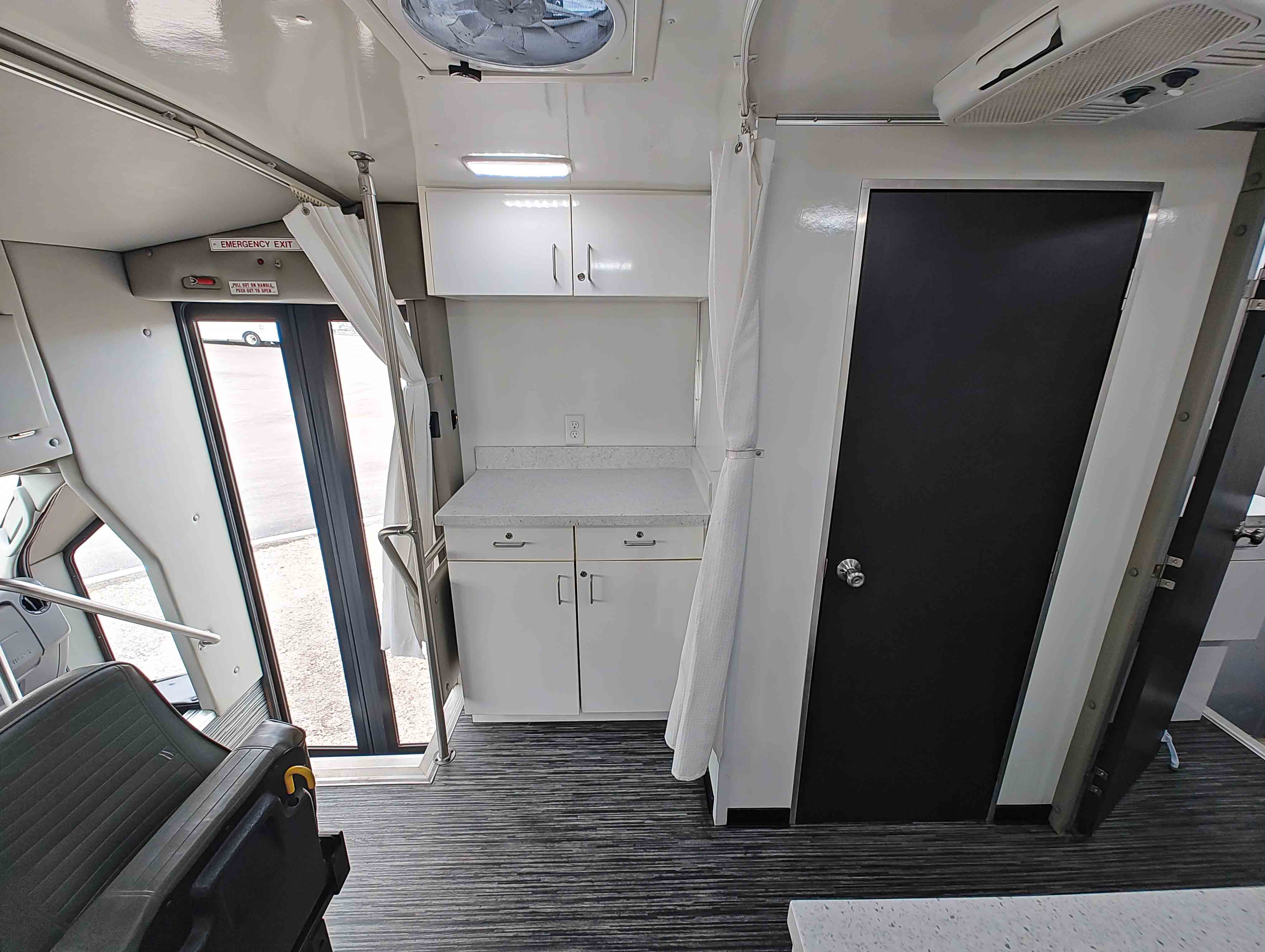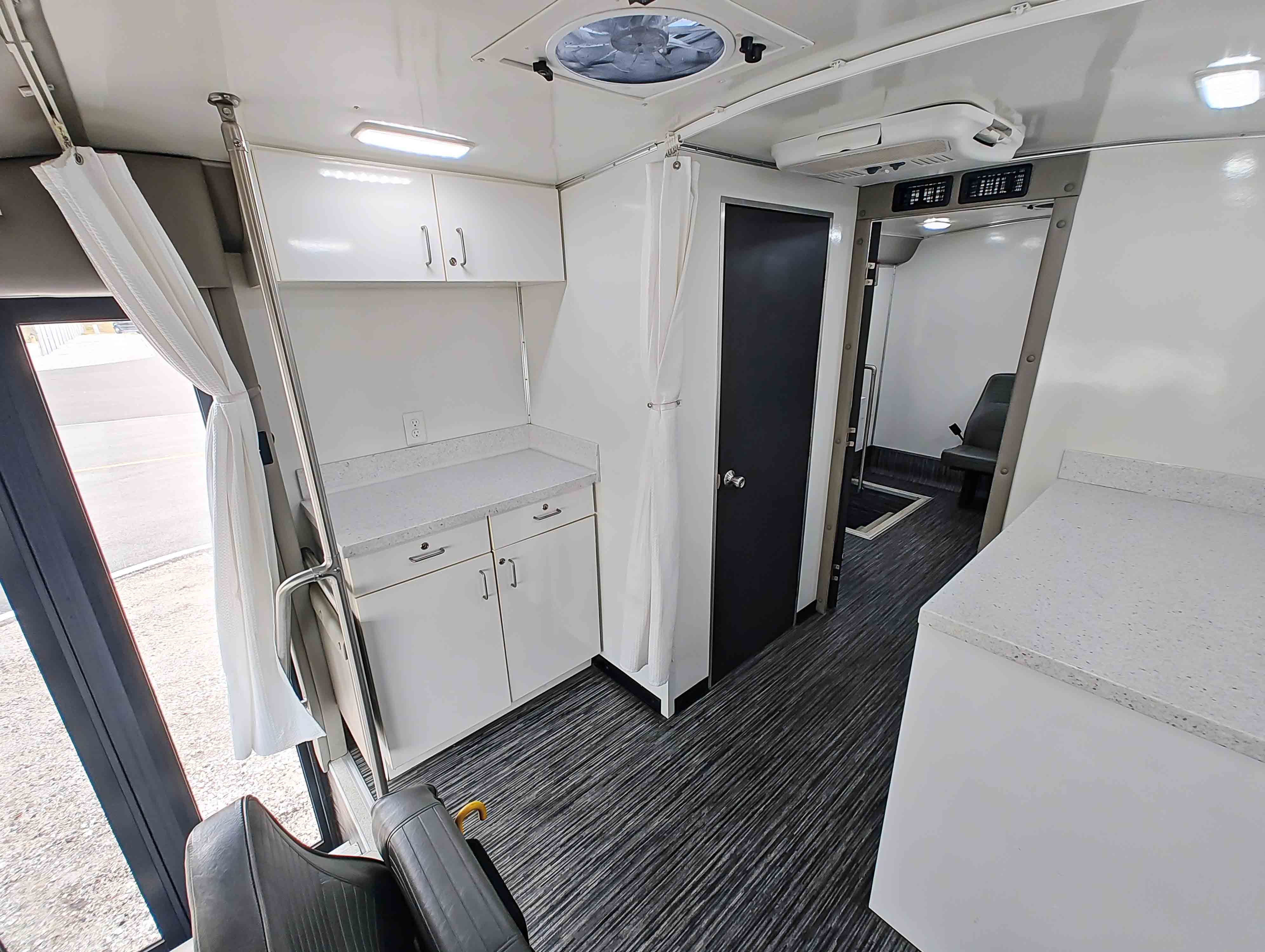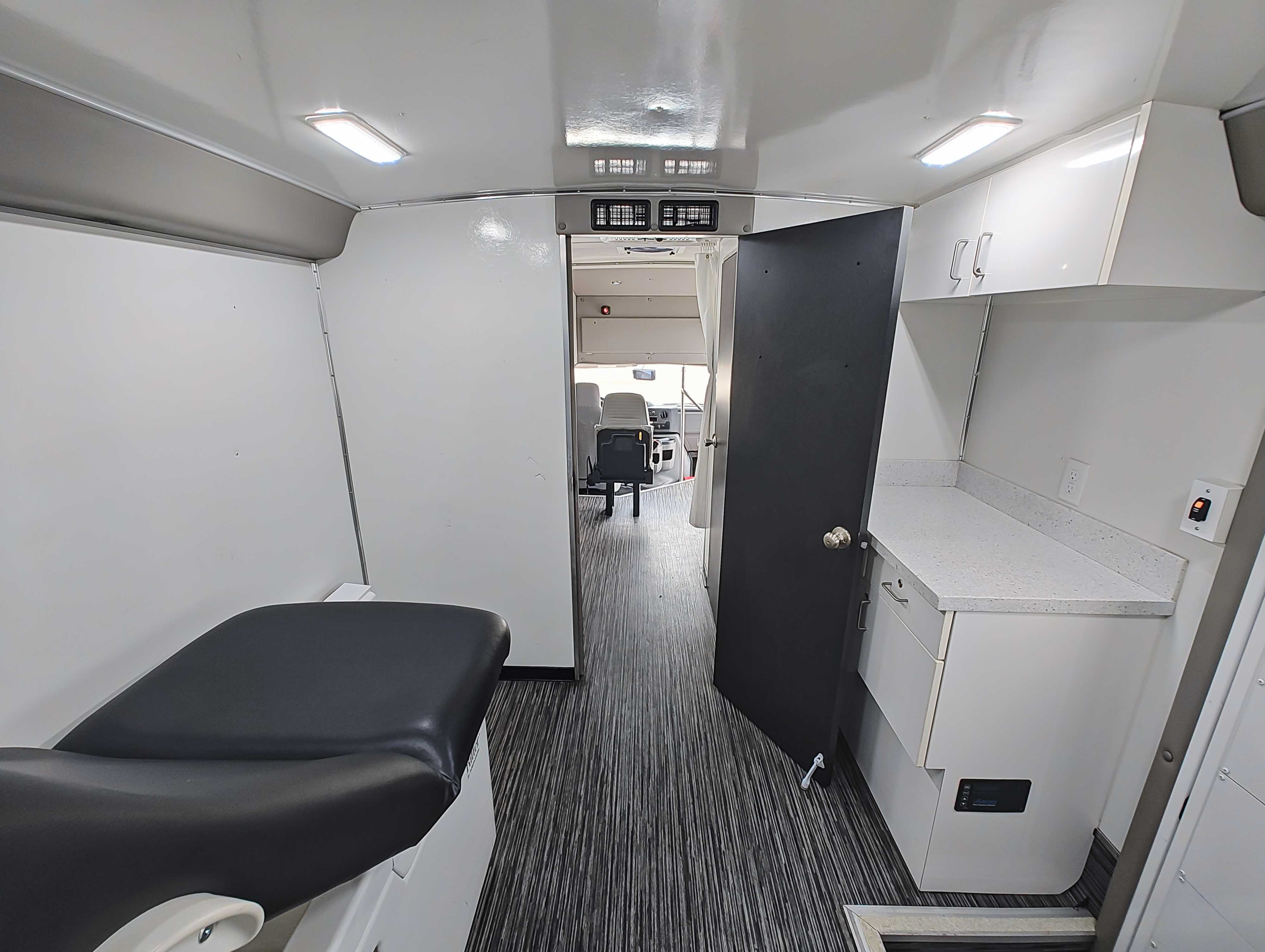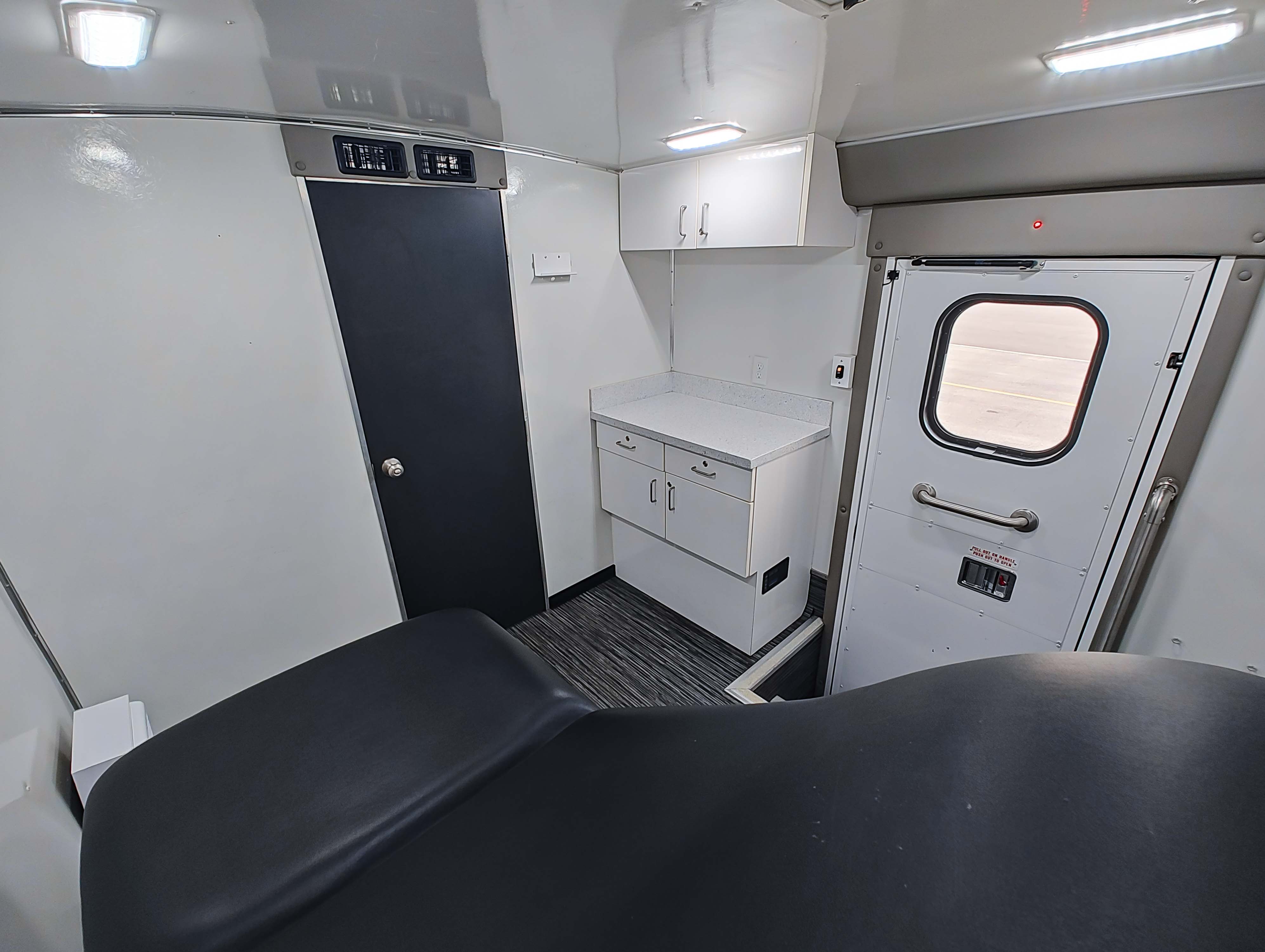 For sale is a 2021 2 Room Mobile Clinic With Dual Entry with only 32,632 miles! This dual-entry unit features a 7 kW Cummins Onan Generator, 50 amp shore power access with a cord, and a RVS camera system. The front exam room includes upper and lower locking cabinets, Accucold medical fridge, rooftop power vent, Dometic rooftop AC, and a flip seat for an additional passenger. The bathroom is equipped with a sink, rooftop power vent, and a Level Guard tank monitor. The rear exam room includes a Ritter 204 exam chair, upper and lower locking cabinets, rooftop power vent, toe kick heater and a flip seat for an additional passenger.