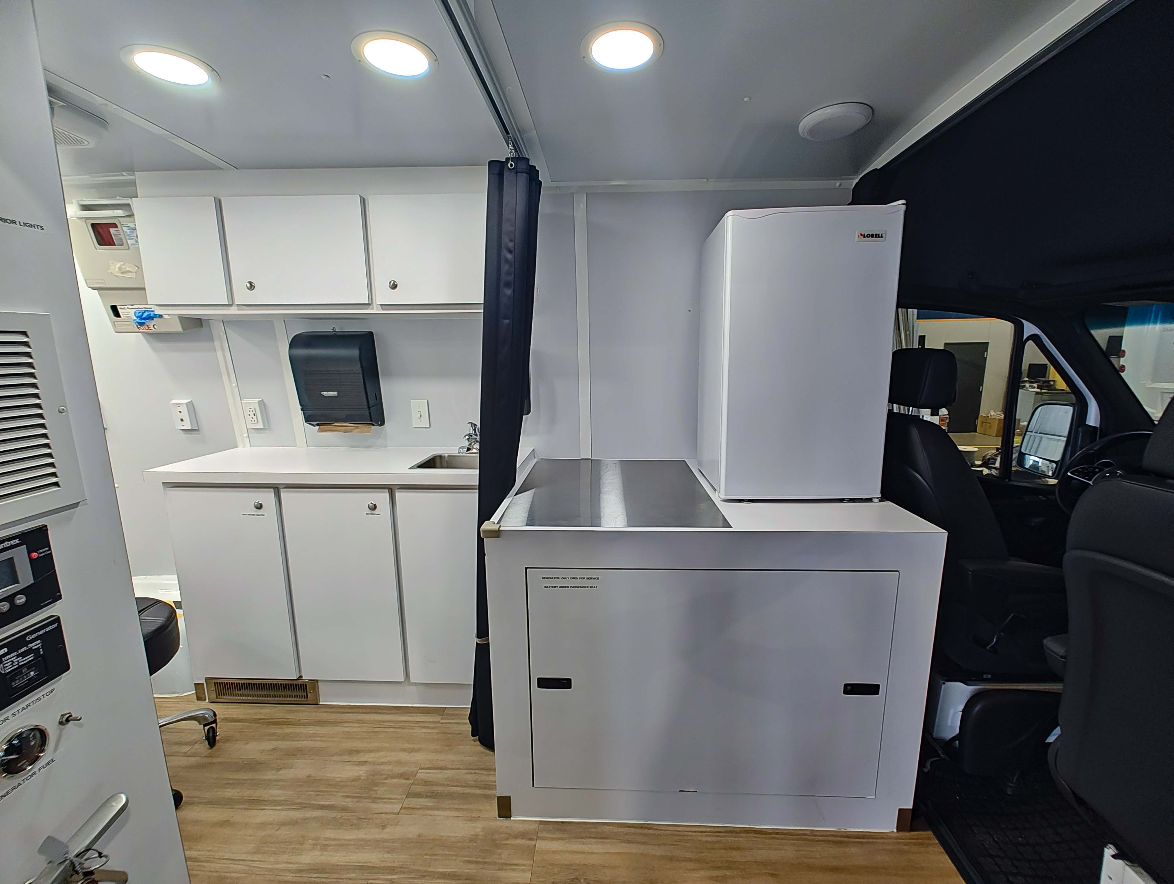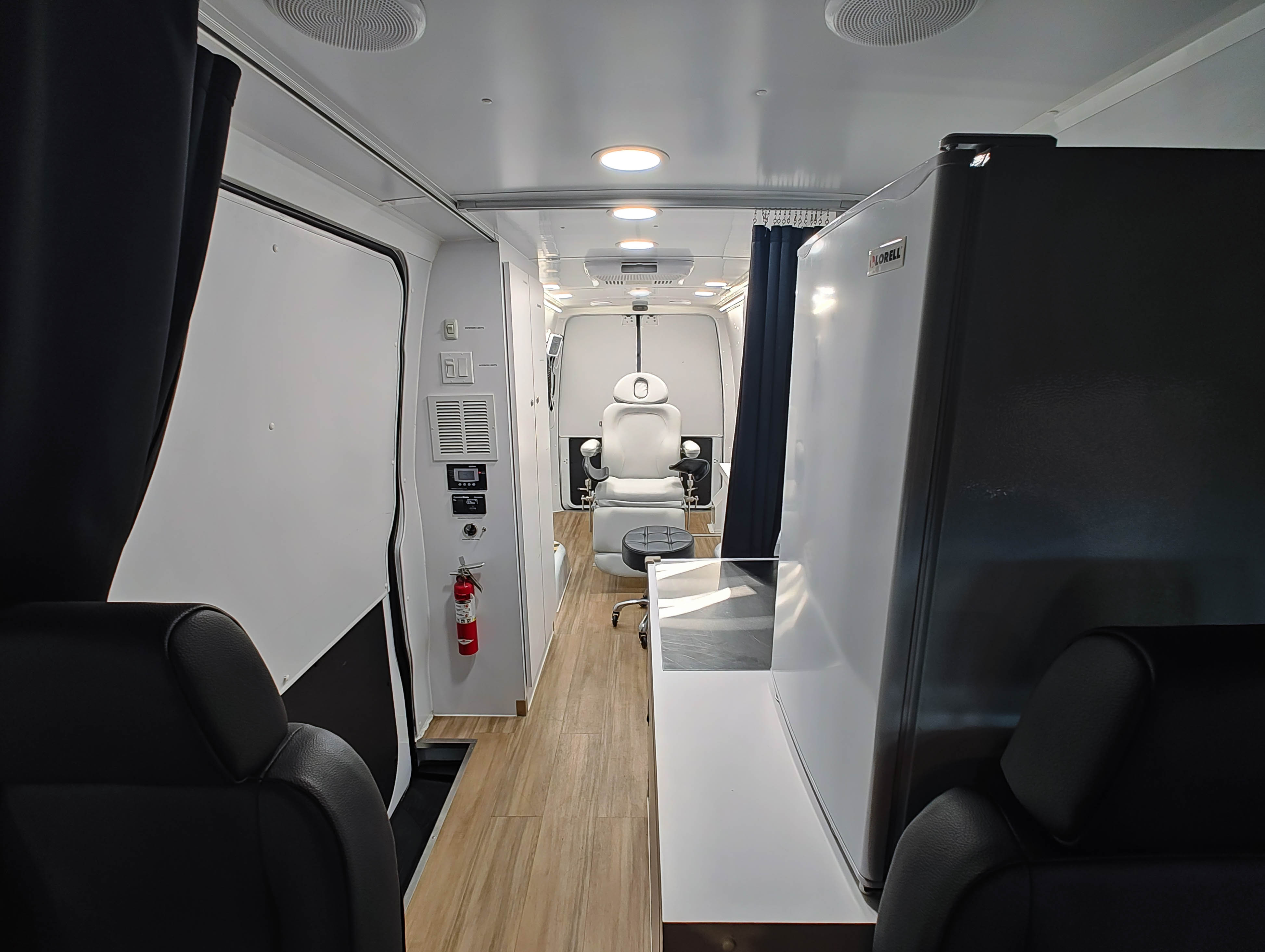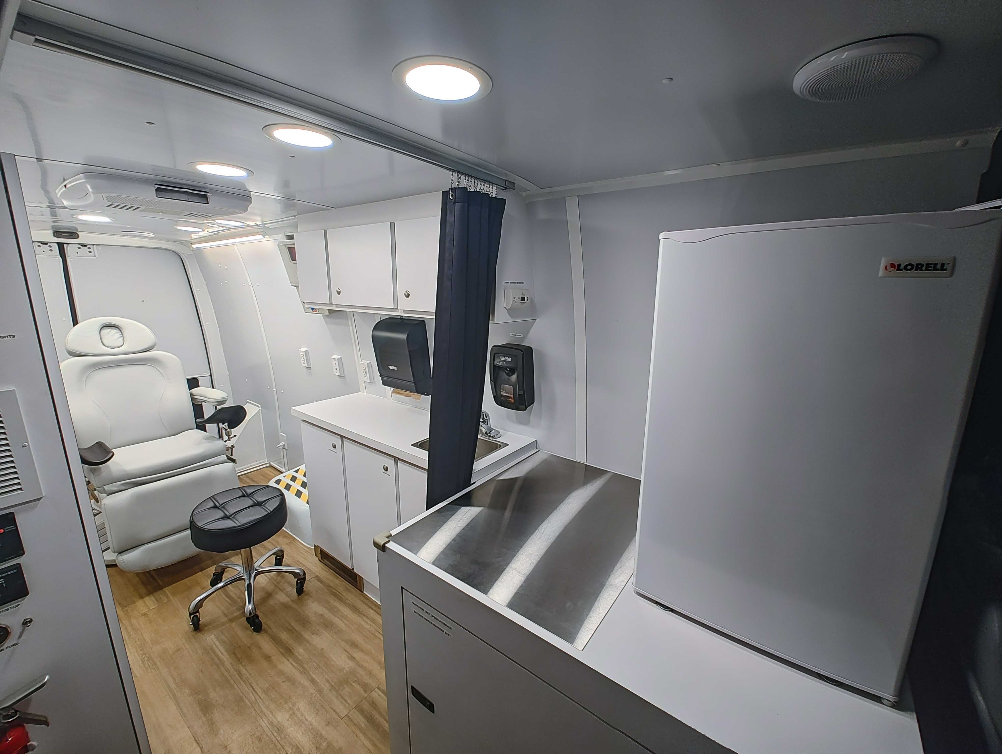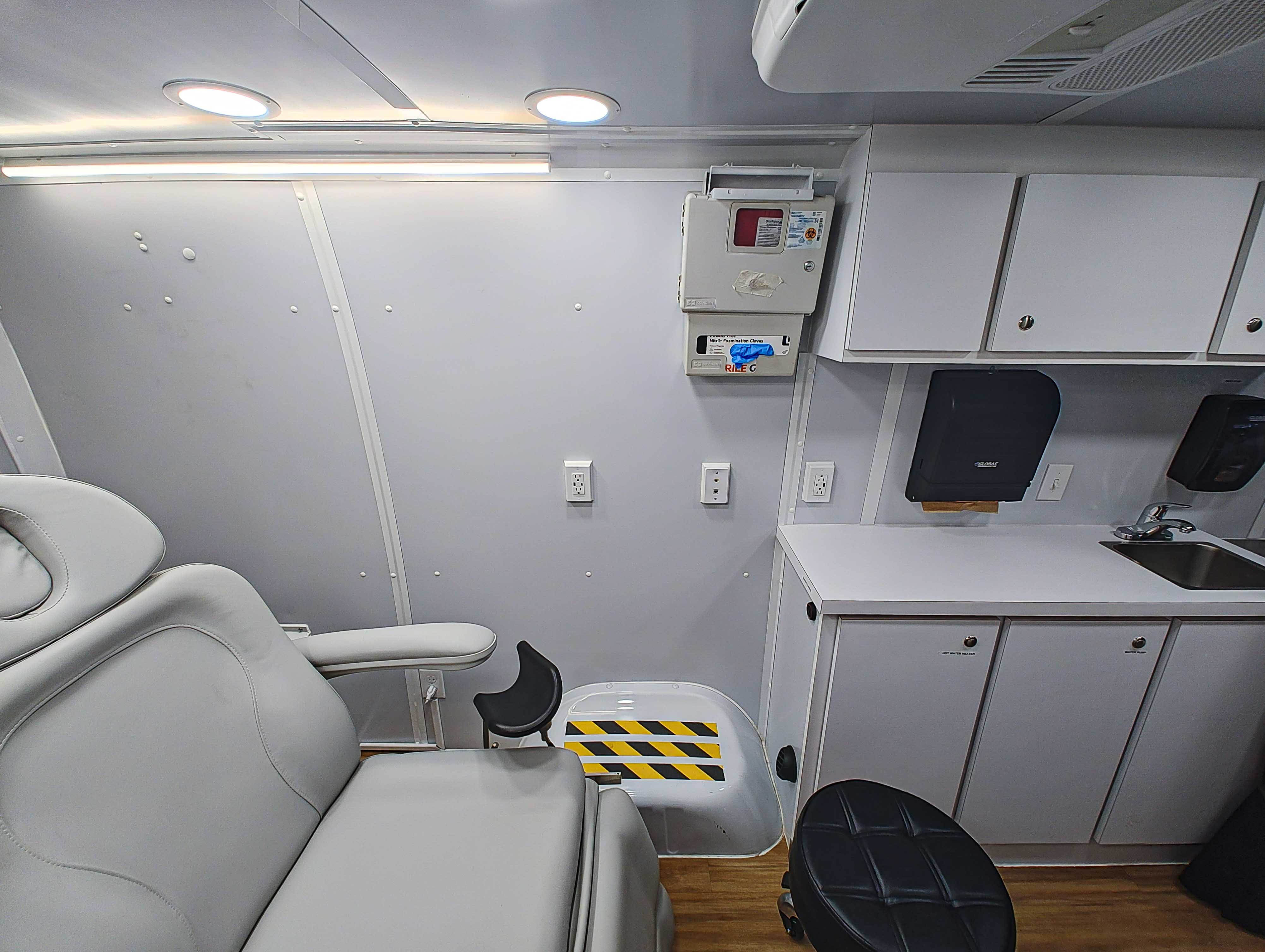 For sale is a 2022 Mercedes Sprinter Mobile Clinic with just 6,349 miles. This unit has been meticulously maintained and is ready for immediate use! It comes equipped with a 7.6 Cummins Onan generator, 50 AMP shore power access with cord, an exterior GFCI dual outlet, a Fiamma power awning, a backup camera system, and Kwikee power entry steps. Inside, you'll find a Dometic rooftop AC unit, a McKesson diagnostic board, a Midmark exam chair, a Lorell refrigerator, a sink with heating, lower thumb-locking cabinets, an IT storage cabinet, a Covidien sharps container, a glove dispenser, Global paper towel and hand soap dispensers, a privacy curtain, LED lighting, and Fusion Bluetooth speakers throughout.