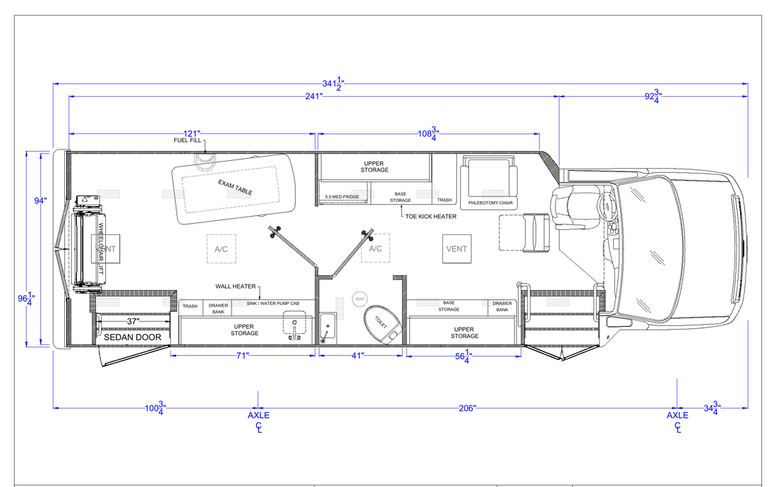 The new Ford E-450 is a versatile and unique mid-size vehicle with wheelchair access, maximizing operational throughput potential. Its rear room wheelchair lift and two additional access points offer flexible service options, ideal for challenging areas. Equipped with standard features like an exam table, medical-grade fridge, and bathroom, it’s easy to drive and has a full roll cage for safety. The Ford E-450’s sharp-looking exterior and comfortable interior make it stand out, providing accessibility, functionality, and safety for any customer application.