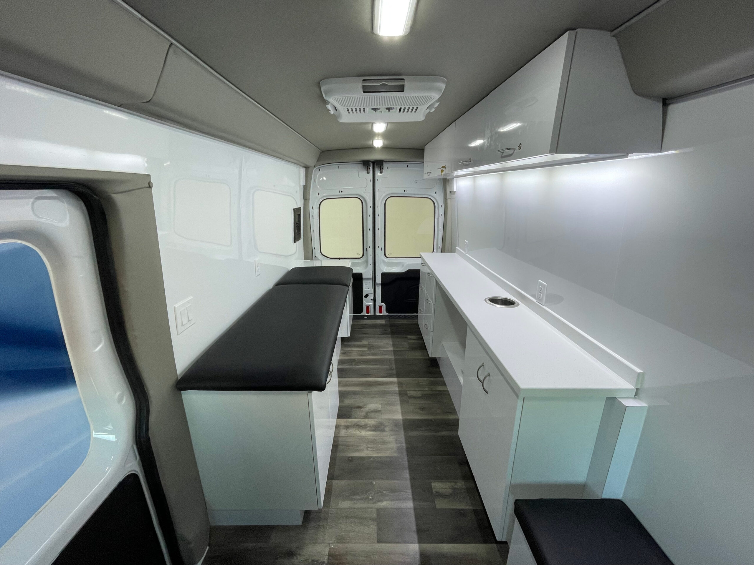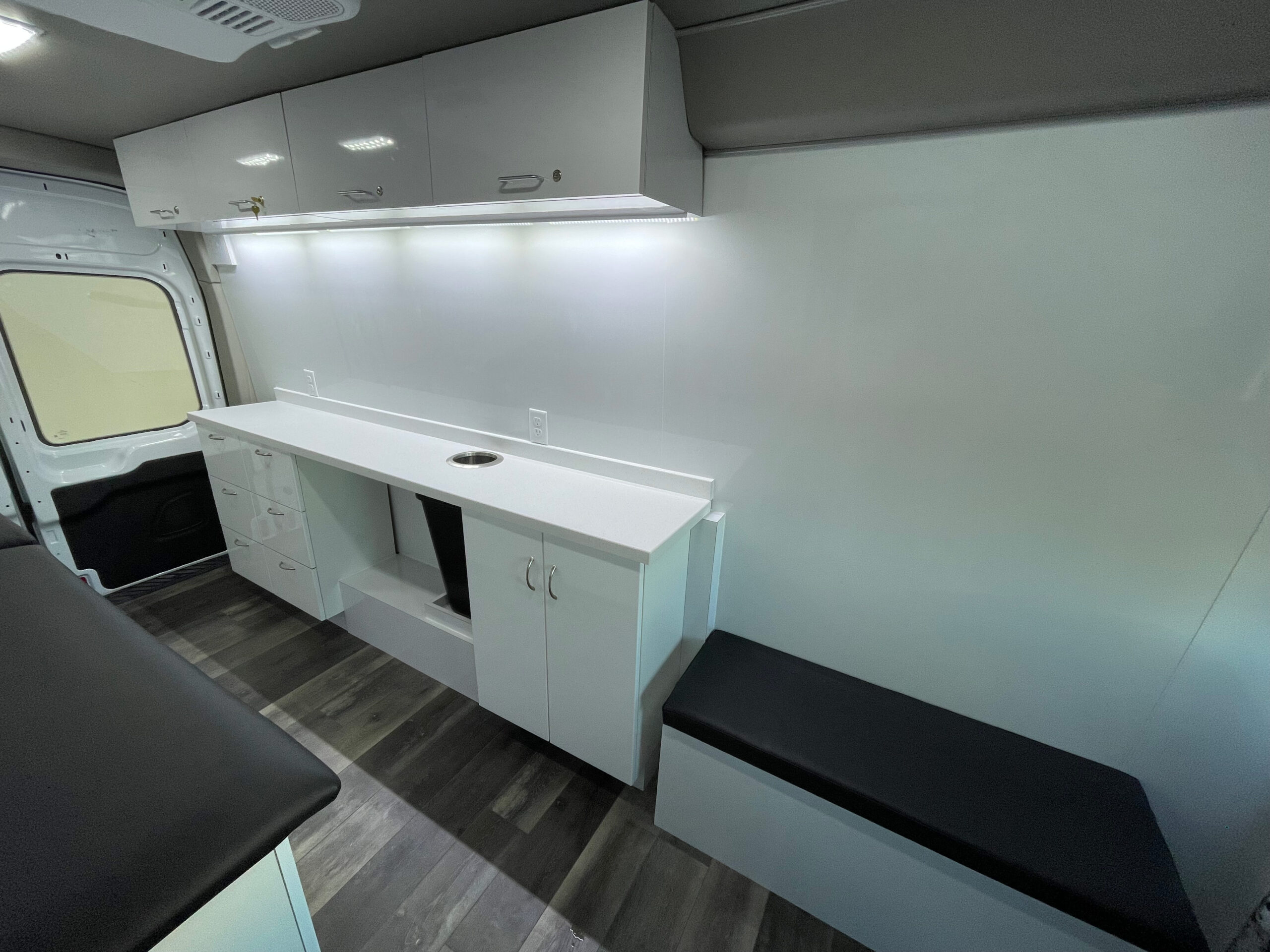 For sale is a 2017 Ford Transit Specialty unit with 70,726 miles. This unit has ideal floor space for 1 exam area, with the exam bed built into the wall for stability and the back incline adjustable for comfort, still allowing for great work flow. It comes equipped with passenger and driver side awning systems, newer flooring that’s in excellent shape, Black and Decker Fridge, power windows and locks, power steering, tilt steering, AM/FM/MP3 Stereo, manual entry door, entry grab handle, dash heat/AC, rear dome lights, vinyl seating, rear storage, exterior storage compartment on driver side, medical equipment, and much more.