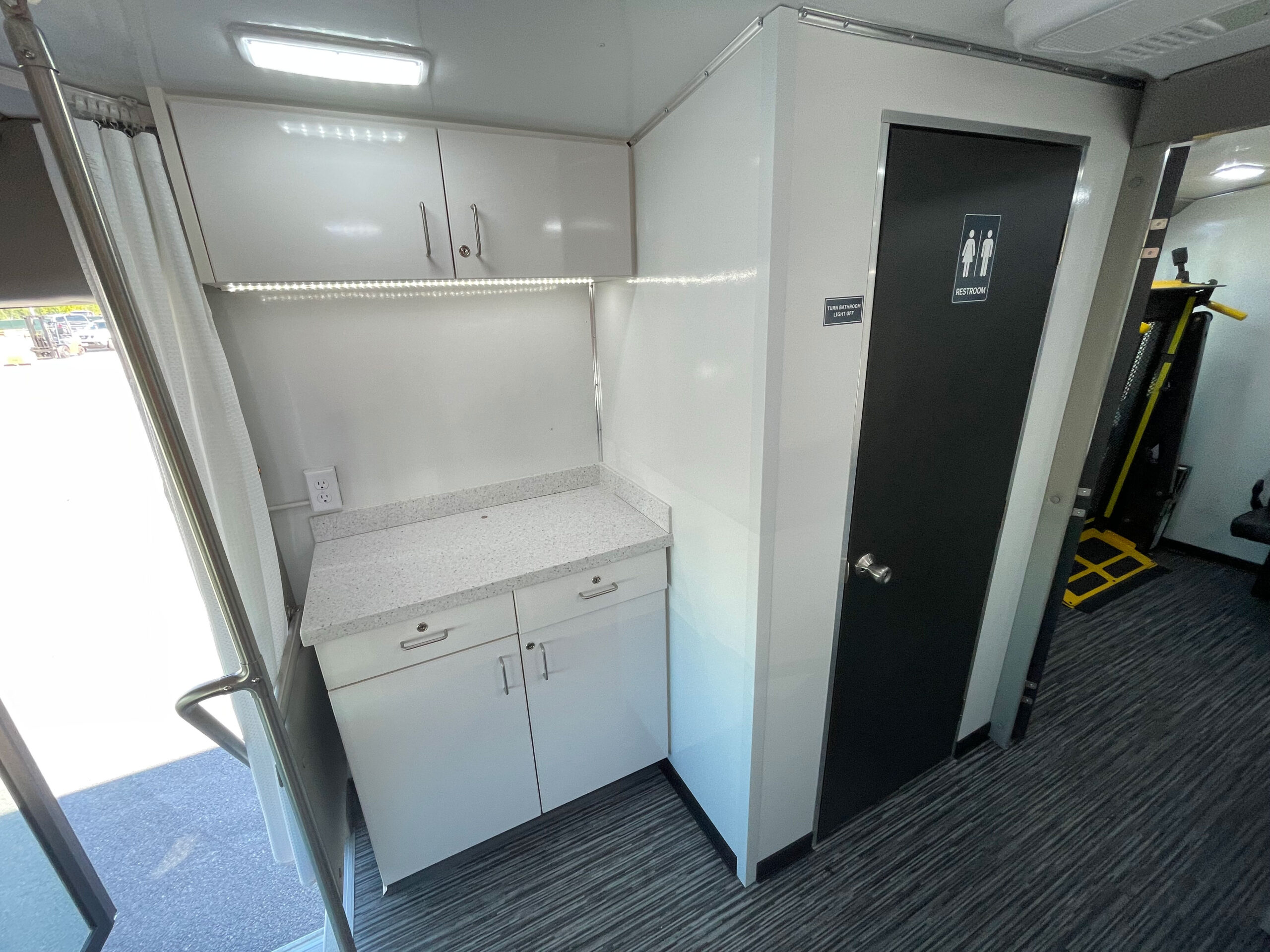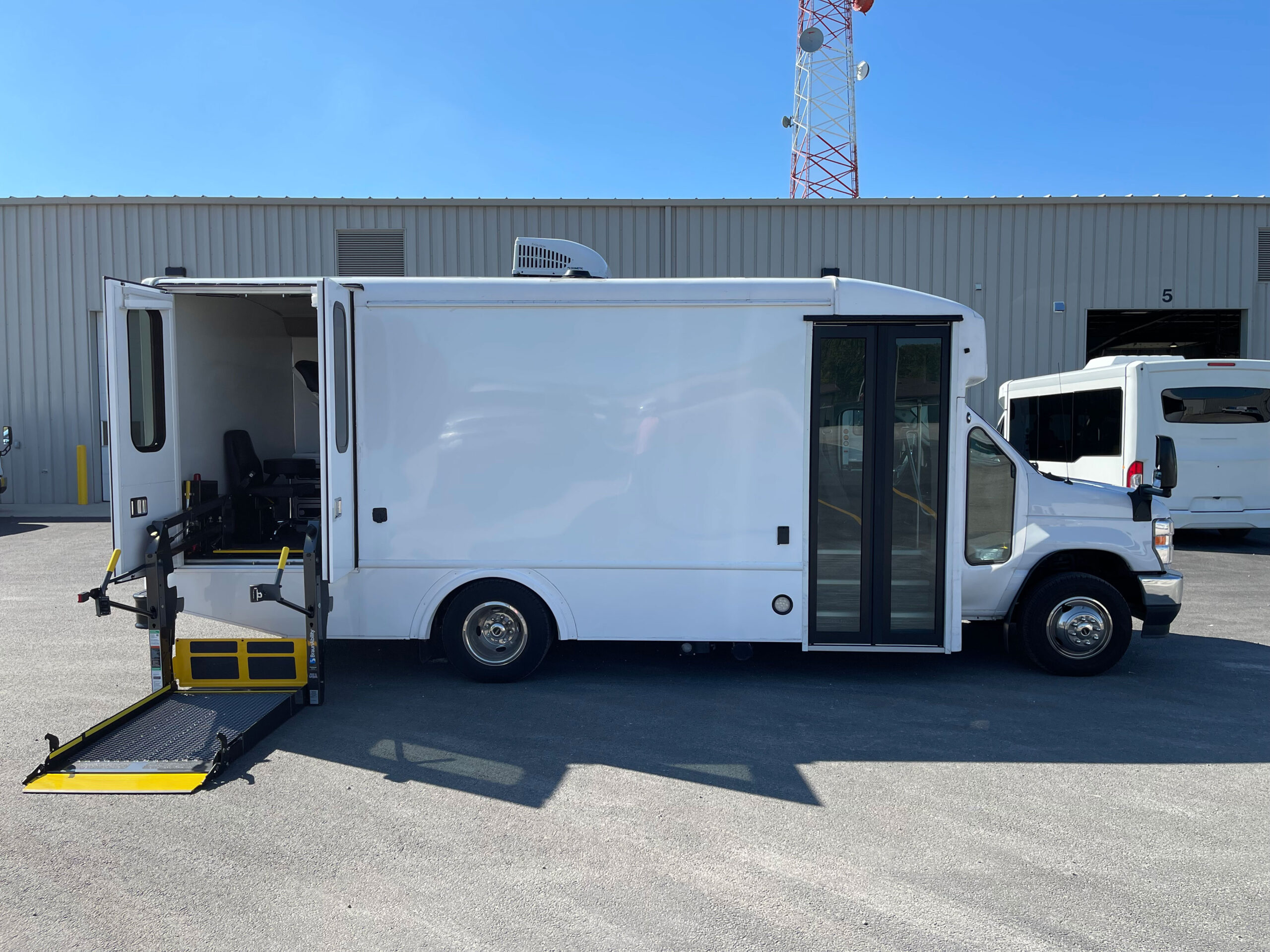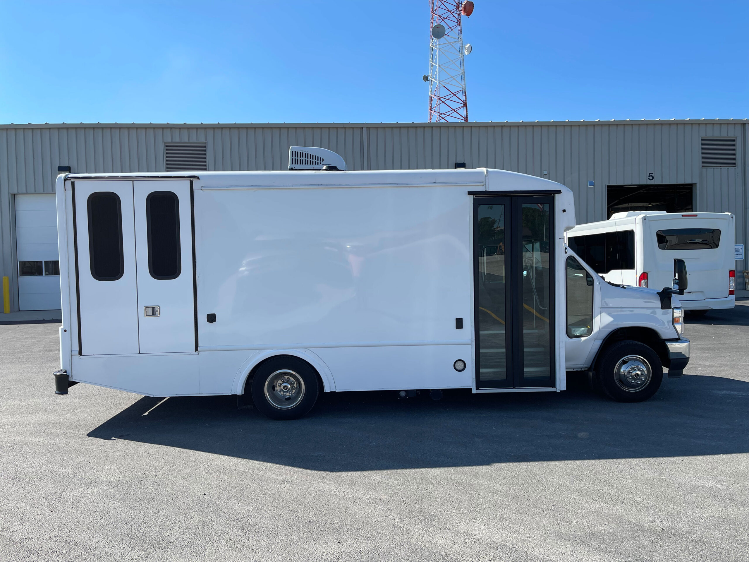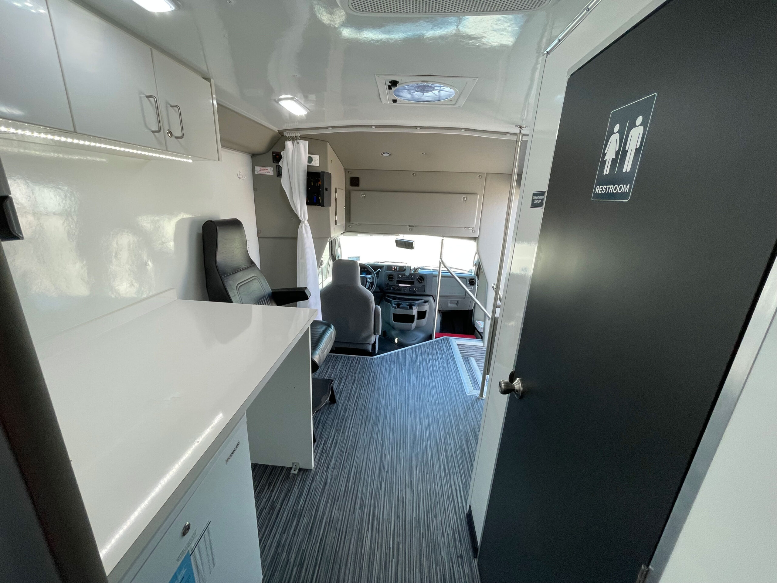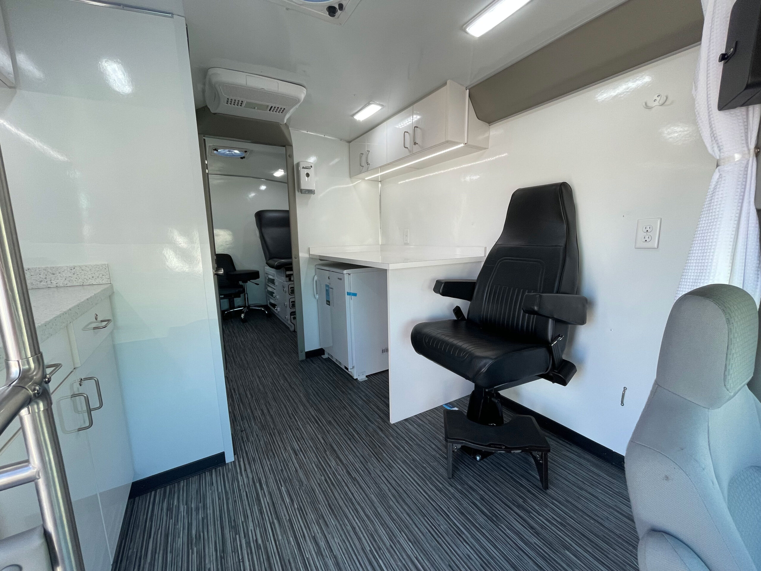 For sale is a 2021 Mobile Medical Clinic on a Ford E450 chassis with the mileage under 10k! This unit is in excellent shape and still feels ‘Like New’ as it was not deployed daily. It features two exam areas, with the front room containing an adjustable vinyl chair for taking vitals or light exams, and the rear exam has a physician’s stool and Ritter 204 Exam Bed for full exams. There is also a restroom onboard with a standard RV toilet, sink, mirror, soap dispenser, paper towel holder, and tank system underneath. This medical clinic is equipped with a Cummins Onan 7 Kw Commercial Generator under 100 hours, 50 Amp Shore Power access w/ cord, Dometic Rooftop A/C Unit, 2000 Watt Power Inverter, Transfer Switch, Vented header compartment for electricals, (2) Powered 14” Roof Vents, Accucold 5.5 cu. Ft. Fridge, RVS backup camera system with 7” LED display to show both sides and the rear while moving, LevelGuard tank monitoring system for fresh and waste water tanks, Upper and Lower custom laminate locking cabinetry, LED lighting under upper cabinetry, Flip-Seat in rear room with seatbelt, Privacy curtain for driver’s area, Key lock box to store keys, Interior outlets, Mofi Wi-Fi system, USB and Type-C charge ports, Rear wheelchair doors blinds, Exterior GFCI outlet, Fresh water fill on exterior, Exterior storage compartment, Driver’s side Diamond Plate Running Board, (2) Coat hooks, Fire Extinguisher, First-Aid Kit, other emergency equipment and much more.